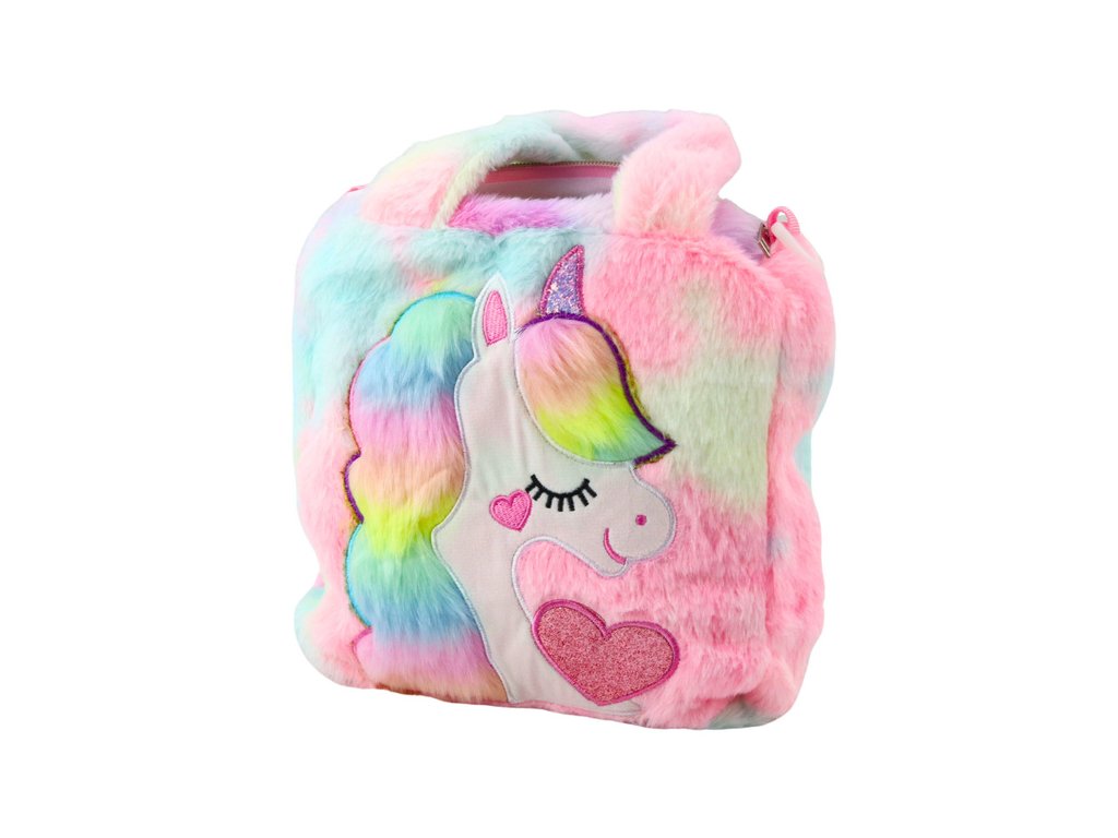 Geantă adorabilă cu tematică de unicorn este accesoriul perfect pentru toți micii iubitori de basme. Este confecționat din pluș moale și pufos și va încânta cu designul său colorat, detaliile strălucitoare și imaginea brodată a unui unicorn cu inimă. Geanta este ideală pentru depozitarea unor mici comori, jucării sau gustări în timpul plimbărilor și excursiilor.