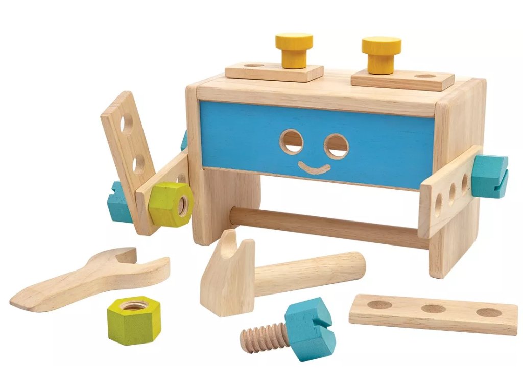 Geantă practică din lemn pentru unelte, care poate fi ușor pliată și transformată într-un robot simplu. Potrivită pentru copii de la 3 ani, combină spațiul de depozitare cu elementul de joacă.