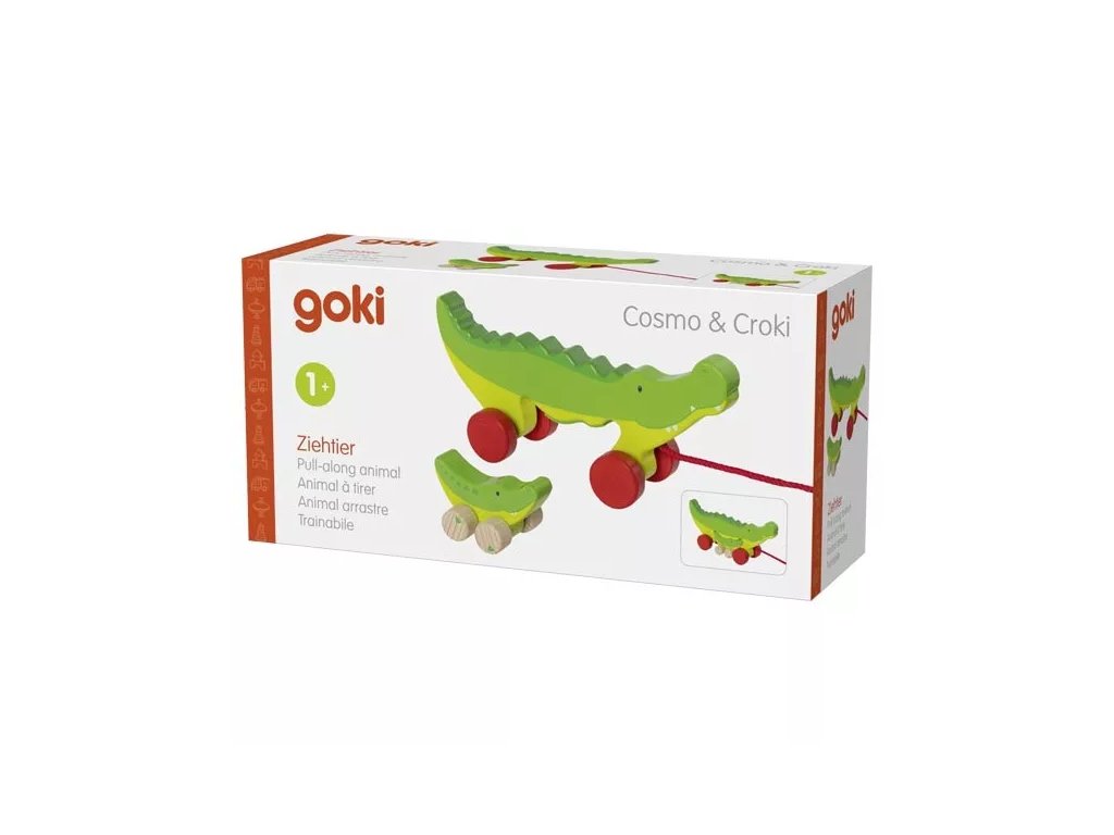 Jucărie de tras din lemn, formată din două părți interconectate — un crocodil adult și un pui. Părțile pot fi separate și utilizate individual, fiecare având propriile roți și putând fi trasă sau împinsă.