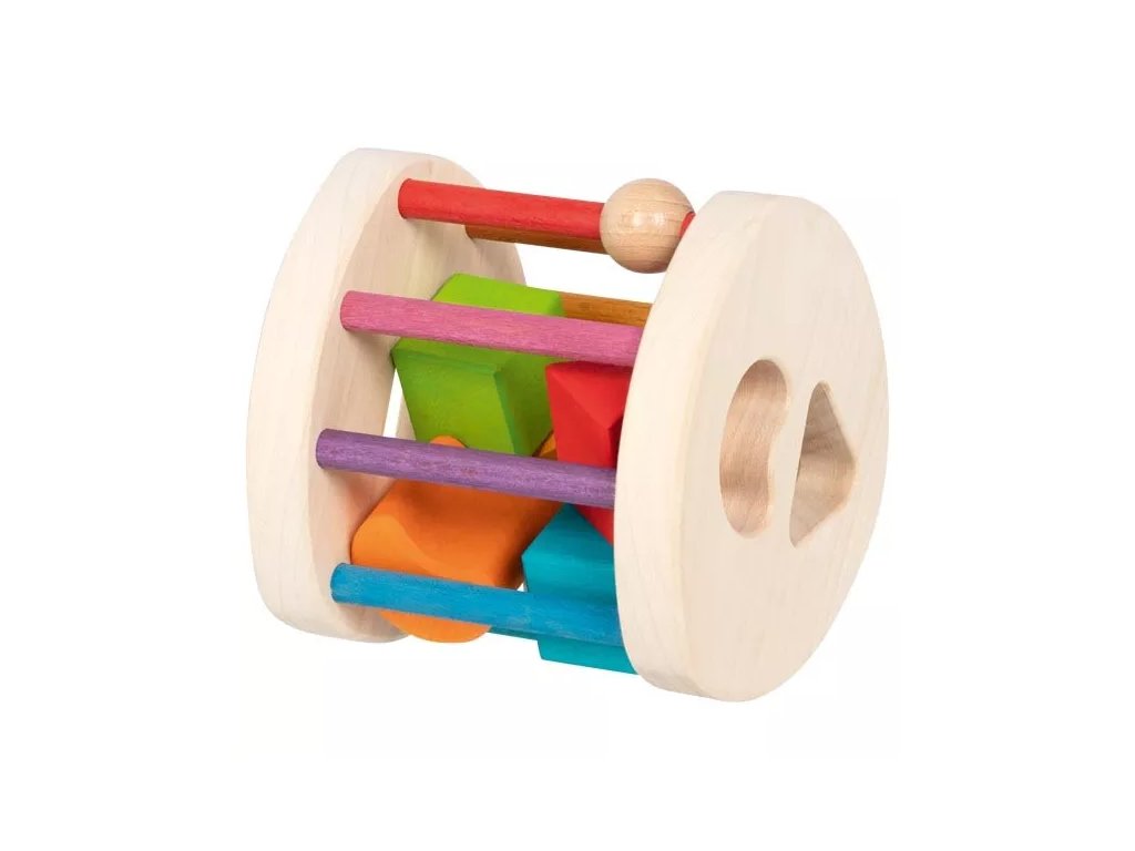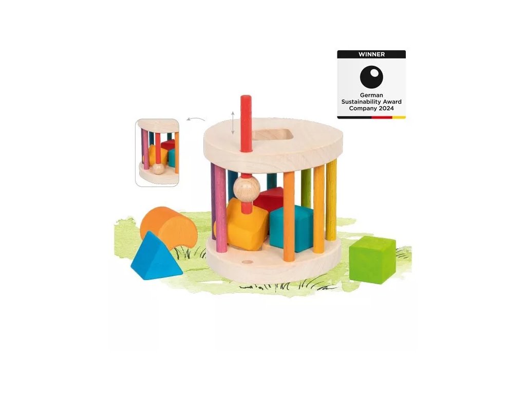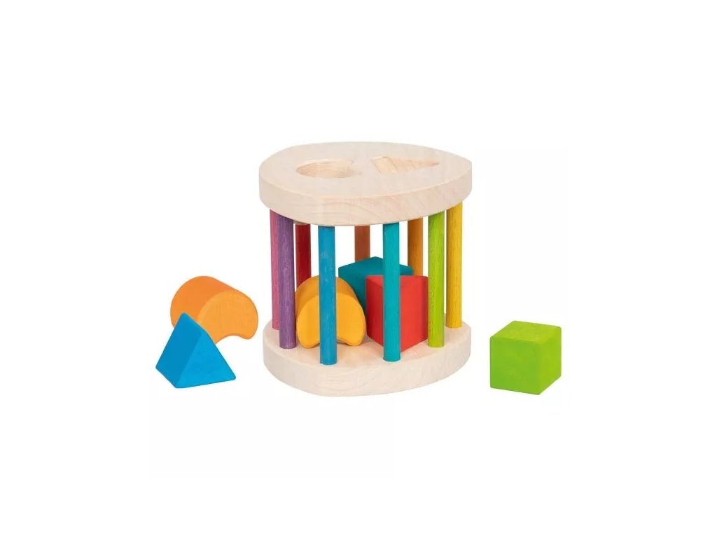 Cușca de inserție este o cutie de sortare din lemn cu un set de blocuri modelate. Pentru a scoate blocurile, este suficient să trageți pur și simplu tija în sus în cușcă. Conceptul armonic de culoare completează designul și face ca jucăria să fie potrivită pentru camera copiilor.