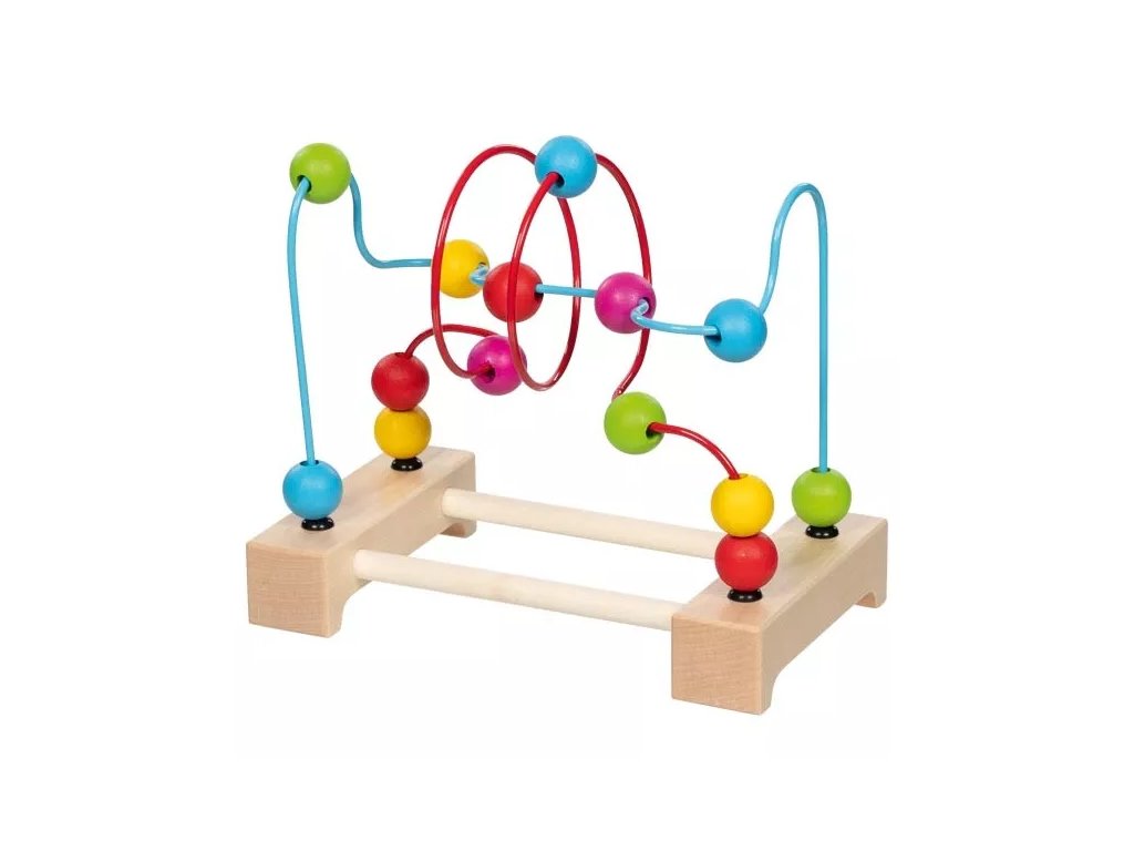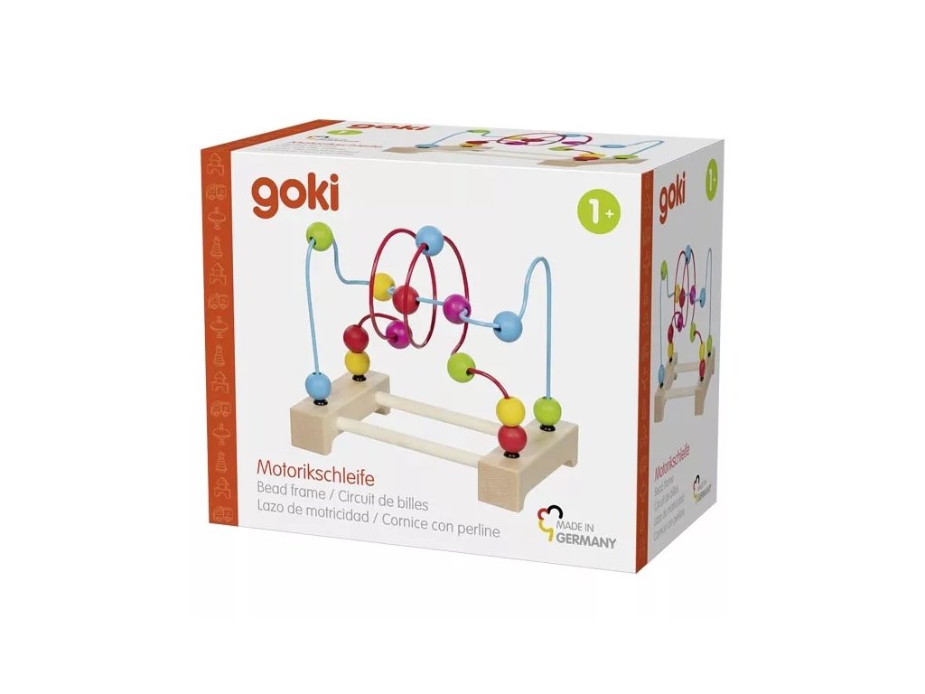 Labirint colorat cu mărgele din lemn de la marca germană Goki, potrivit pentru camera copiilor. Jocul este conceput pentru a dezvolta abilitățile motorii fine și abilitățile senzoriale de bază.