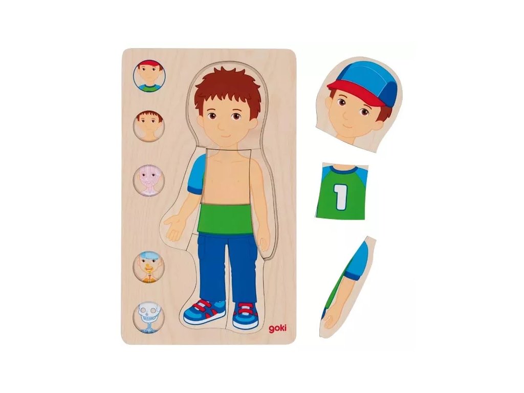 Puzzle-ul stratificat din lemn ilustrează structura internă a corpului uman sub formă de straturi dezvăluite treptat. Straturile individuale conțin ilustrații ale scheletului, circulației sângelui, organelor interne și mușchilor.