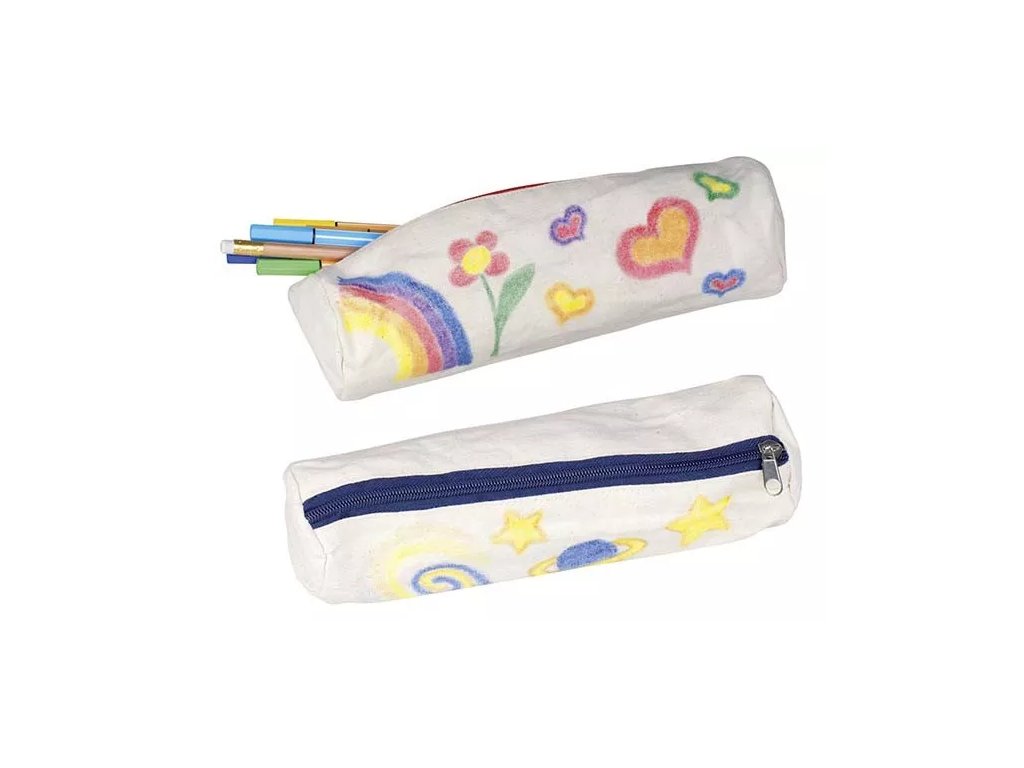 Husă de bumbac concepută pentru a fi colorată cu creioane textile, practică pentru depozitarea creioanelor și a altor obiecte mici.