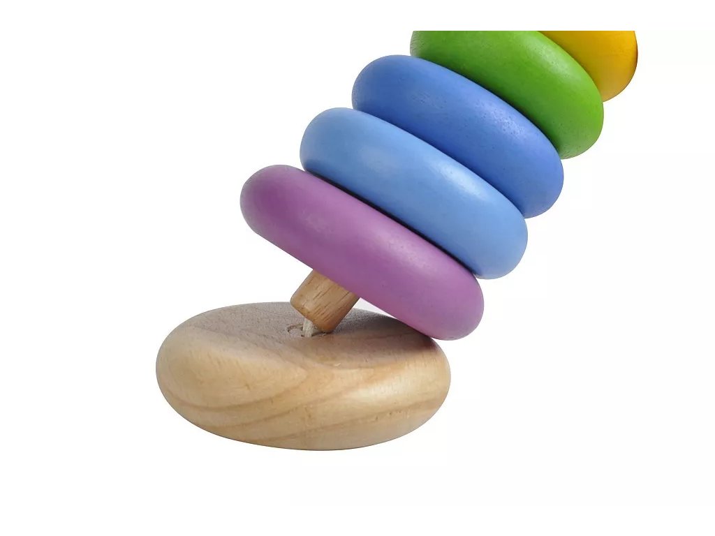 Setul colorat de inele din lemn este folosit pentru a exersa recunoașterea dimensiunilor și culorilor. Tija plasată în mijloc este pliabilă din motive de siguranță.
