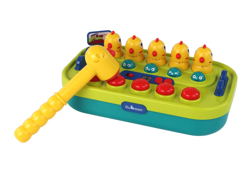 Sarcina ta este să apeși butoanele strălucitoare cu ciocanul, ceea ce va face ca puii să se miște și să acumuleze puncte. Tabloul arată numărul de puncte marcate și ritmul jocului crește odată cu numărul de puncte marcate. Dacă aveți nevoie de o pauză, jocul vă permite să întrerupeți sau să reporniți cu două butoane roșii. Acest lucru adaugă flexibilitate și confort în timpul jocului. De asemenea, în pachet este inclus un ciocan galben care scoate un sunet de pui când este scuturat pentru un plus de distracție în timpul jocului.