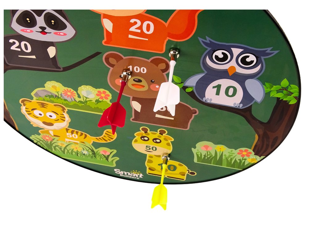 Ținta, ținută în verde, este decorată cu animale drăguțe precum o girafă, vulpe sau tigru, fiecăruia cărora li se atribuie anumite puncte pe lovitură. Această temă cu animale nu numai că încurajează copiii să se joace, dar face și distracția și mai plăcută și mai magică.