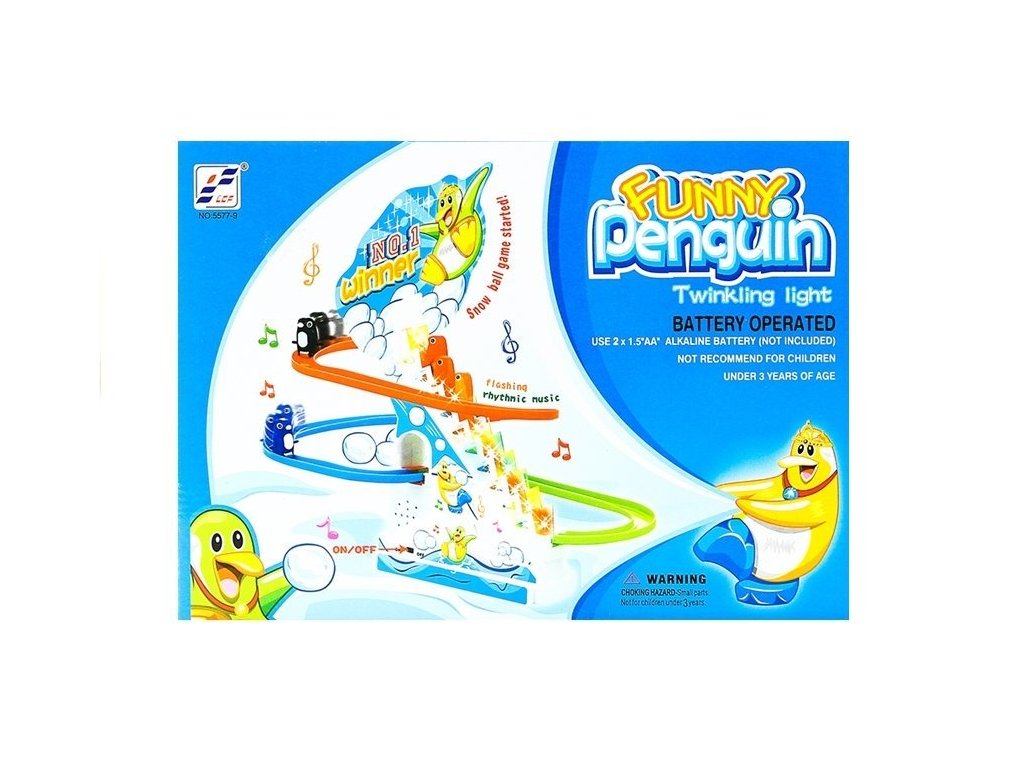 Jocul constă în pinguinii care urcă treptele până la tobogan și apoi coboară treptele în mișcare. Pe tot parcursul jocului, se aud strigăte de admirație și o melodie veselă care adaugă intensitate distracției. Acest set va oferi copiilor 100% distracție și bucurie.