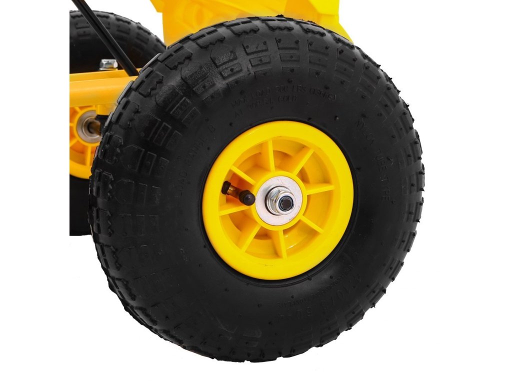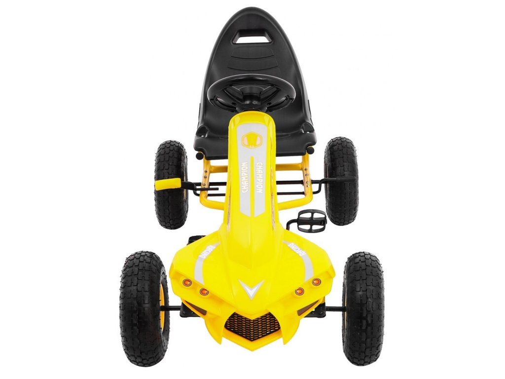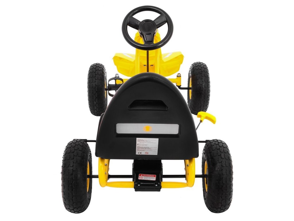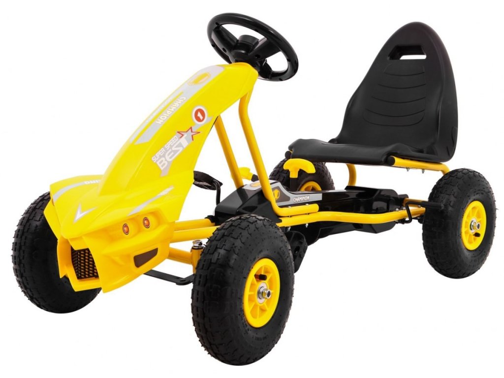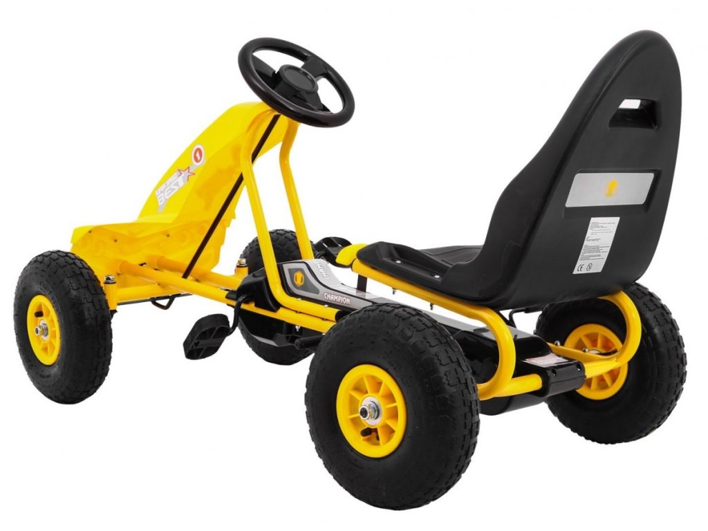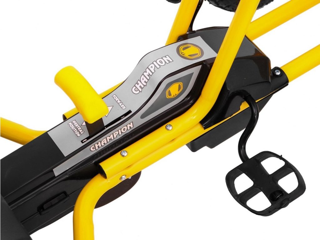Kartul cu pedale pentru copii Champion este o pedală pentru copii foarte bine realizată, cu un design modern. Construcția metalică prelucrată cu precizie în combinație cu plasticul de înaltă calitate garantează că go-kartul nu este doar o afacere sezonieră. Pentru siguranța copilului, este inclusă o frână de mână funcțională, iar spătarul înalt al scaunului cu formă ergonomică monitorizează și sănătatea. Scaunul poate fi reglat si in functie de confortul copilului tau. Pedala permite copilului să conducă înainte și înapoi. Roțile de kart sunt realizate din plastic din cauciuc moale, care asigură o aderență perfectă la suprafață. Go -karturile pentru copii sunt o formă excelentă de exerciții pentru copii. Datorită propulsiei umane, este ecologic și fără zgomot.
