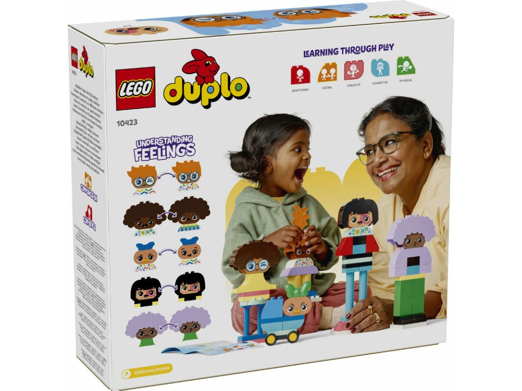 LEGO® DUPLO® Buildable People with Emotions (10423) este un set grozav pentru copiii cu vârsta peste 3 ani, care susține dezvoltarea socială și emoțională. Setul conține 71 de blocuri și elemente , inclusiv cinci figurine, blocuri cu păr și 10 blocuri cu diferite expresii faciale, care îi ajută pe copii să recunoască emoțiile și să creeze personaje prietenoase. Combinând diferite părți, ei dezvoltă creativitatea și învață despre diversitatea oamenilor și sentimentele lor.