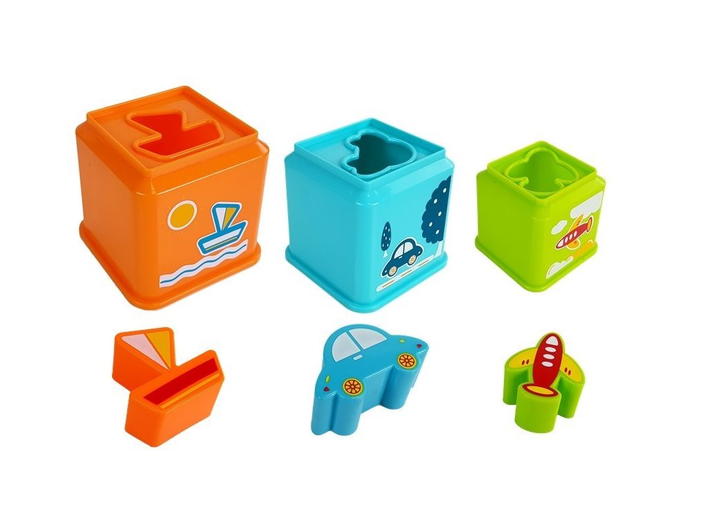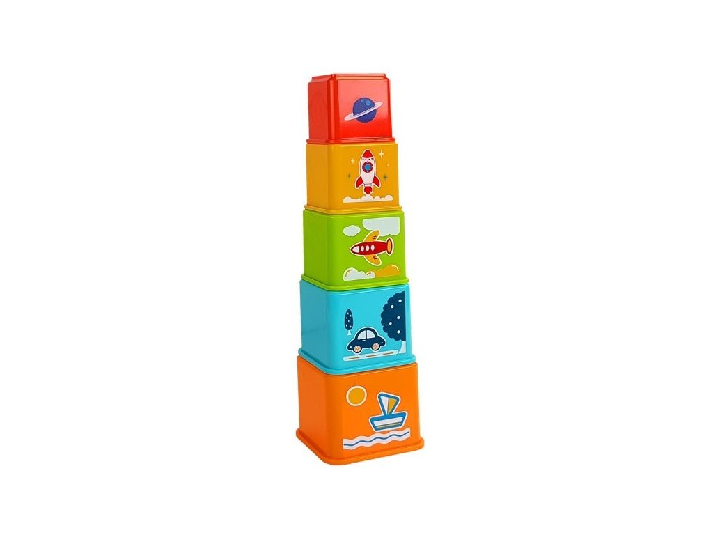 Trusa de construire a piramidei pentru cei mici dezvolta gandirea logica si imaginatia. În fiecare cub puteți introduce mijlocul de transport corespunzător, precum o navă, o mașină de jucărie sau o rachetă. Jucăria te va învăța să recunoști culorile și formele.