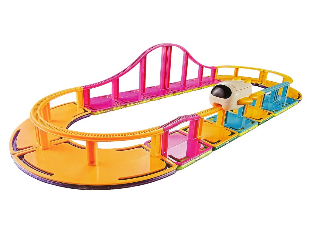 Setul include o carte de idei și 29 de piese pe care copilul le poate aduna pentru a crea o pistă de curse. Fiecare element geometric conține magneți care se conectează perfect, sunt rezistenți la coroziune, siguri și durabili.