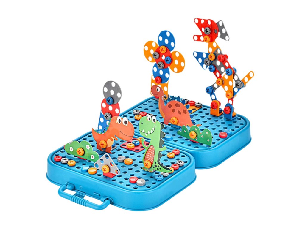 Include un burghiu funcțional pentru copii cu baterii cu biți interschimbabili, șuruburi, șurubelniță, cheie și o mulțime de elemente de construcție colorate. Totul este depozitat clar într-o valiză cu mâner, ideală pentru călătorii și depozitare. Asamblarea și dezasamblarea clădirilor ajută copiii să-și dezvolte abilitățile motorii fine, creativitatea și gândirea logică.