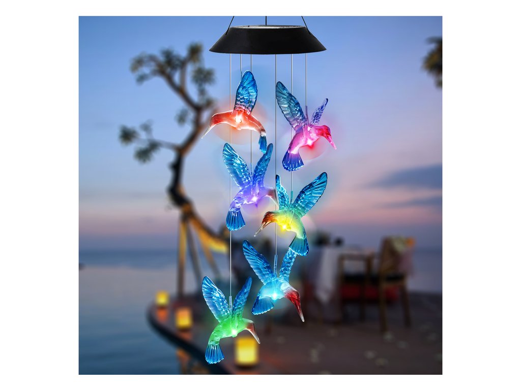 Păsările colibri sunt realizate din duraluminiu rezistent pentru un sunet armonios, în timp ce tuburile acrilice transparente, iluminate de LED-uri RGB, le oferă un aspect elegant. Datorita designului impermeabil, acestea pot fi agatate de copaci, garduri, foișoare sau în ferestre, în timp ce timpul de încărcare la soare este de 6-8 ore și asigură până la 8 ore de funcționare.