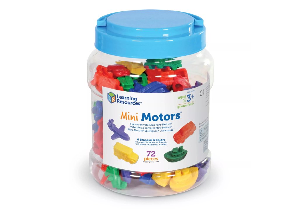 Setul include 72 de vehicule mici concepute pentru joc senzorial, sortare și numărare. Jucăriile sunt colorate, plăcute la atingere și oferă o gamă largă de utilizări în timpul jocului și al învățării.