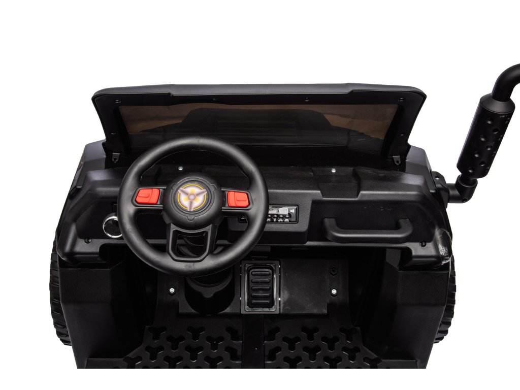 Copilul se va așeza pe un scaun moale, confortabil, din piele ecologică. Se poate asculta muzica preferată în mașinuță, datorită panoului audio de pe bord. Poate verifica starea bateriei, cu ajutorul indicatorului de încărcare a bateriei.