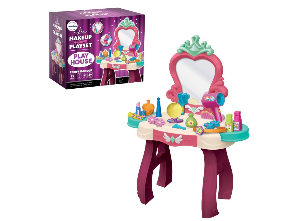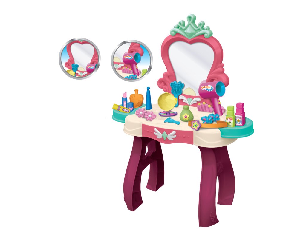 Masa de toaletă are o construcție stabilă și suficient spațiu pentru joacă și depozitare. Include o uscătoare de păr, pieptene, perie, ruj, sticle, decorațiuni florale, oglindă și multe alte detalii. Copiii pot imita machiajul și coafura, își pot dezvolta creativitatea și își pot crea propriile ritualuri de frumusețe.