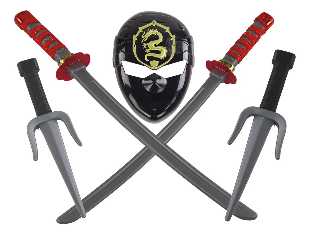 Acest set conține două replici impresionante de săbii , al căror mâner este decorat cu măiestrie cu panglici roșii , oferindu-le un farmec unic. Cele două pumnale adaugă un element de varietate acestei colecții, permițând scenarii diferite și abordând lumea ninja autentică. Întreaga colecție este perfect completată de o mască elegantă de culoare neagră, adâncă, cu un rafinat motiv dragon auriu, simbolizând dexteritatea și misterul.