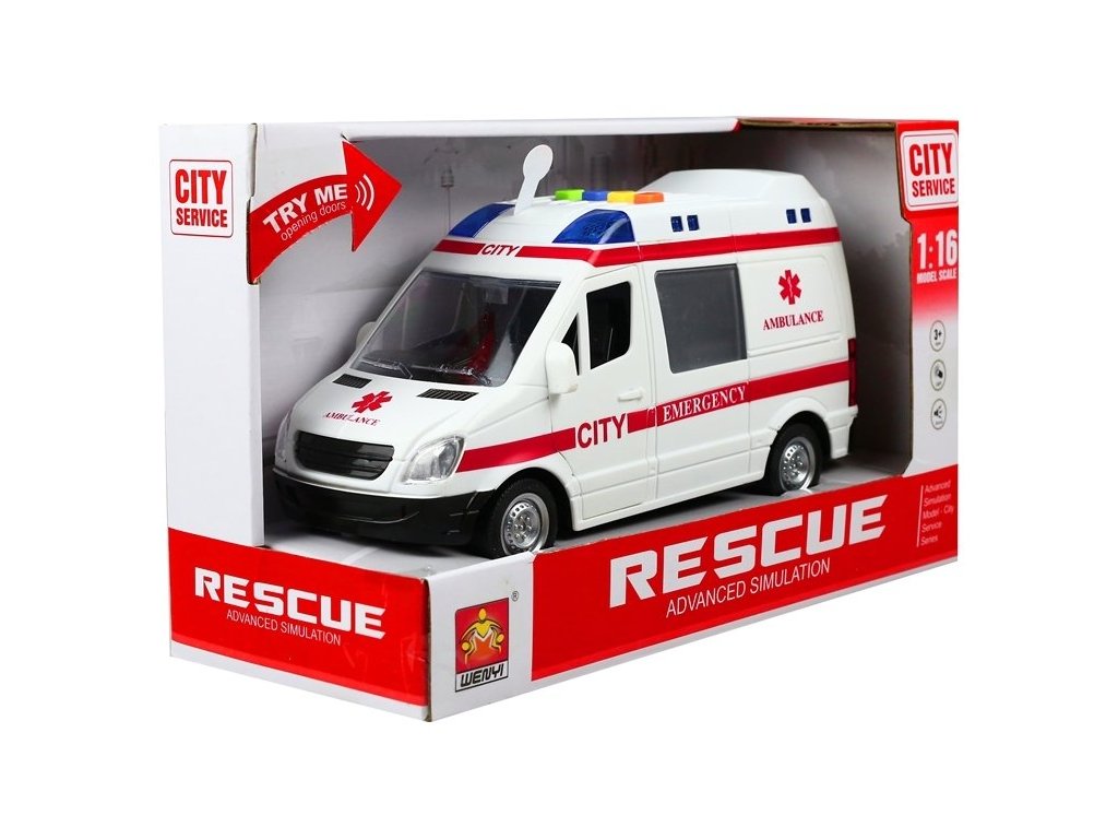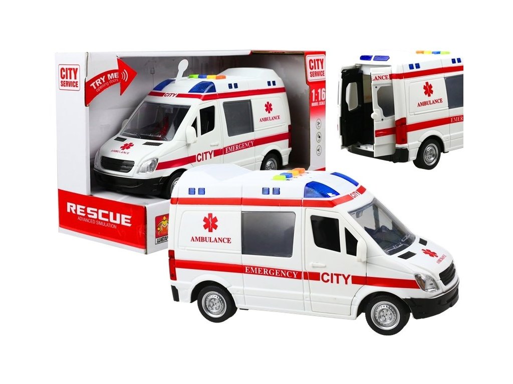 Designul foarte realist al vehiculului, precum și luminile intermitente de pe acoperiș, combinate cu efecte sonore, fac divertismentul foarte autentic și captivant ore întregi. Ambulanța permite copilului să deschidă ușa pasagerului și ușa situată în spatele vehiculului.