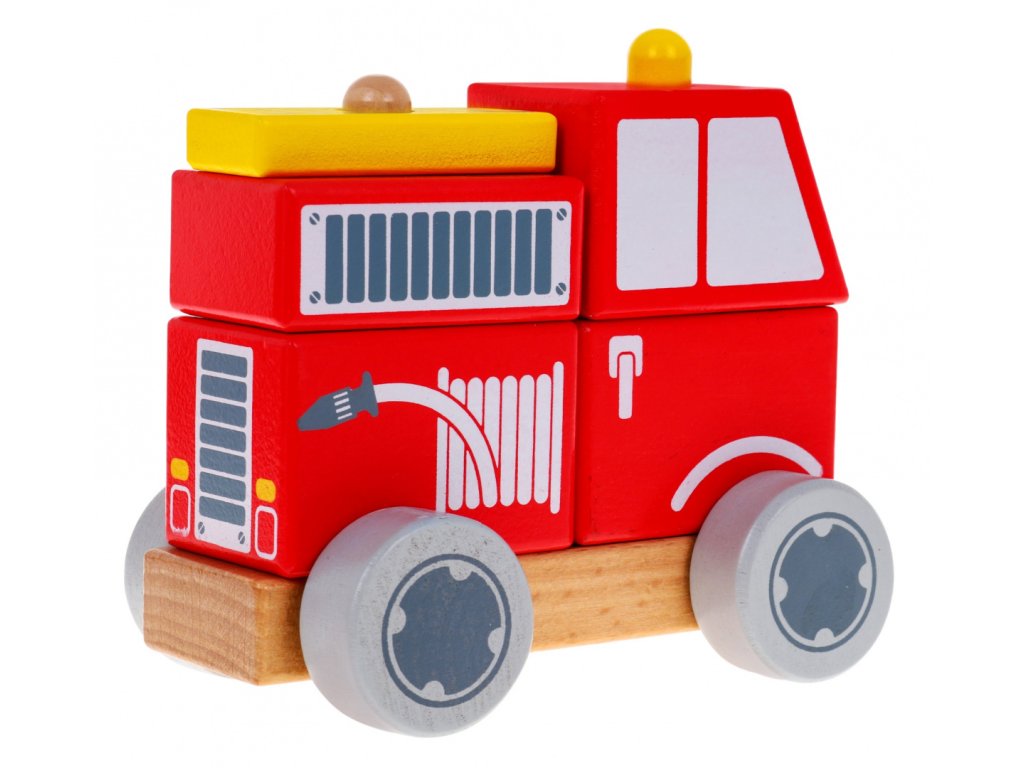Mașina pompierilor din lemn este formată dintr-o bază și patru cuburi. La bază sunt atașate patru roți mobile și două cuie, pe care sunt așezate cuburi de lemn, care, atunci când sunt asamblate, formează o mașină de jucărie mobilă din lemn.