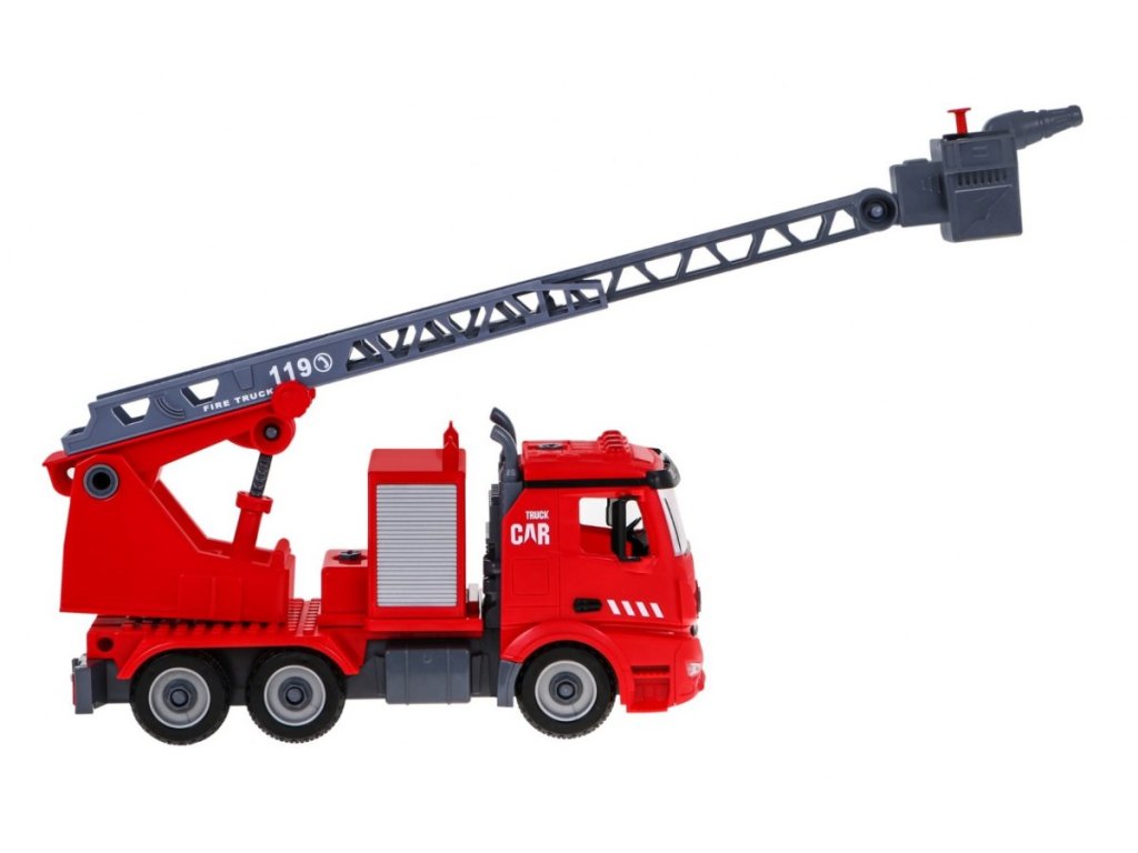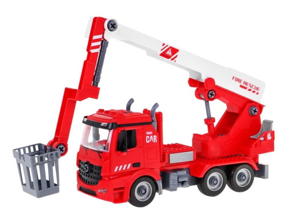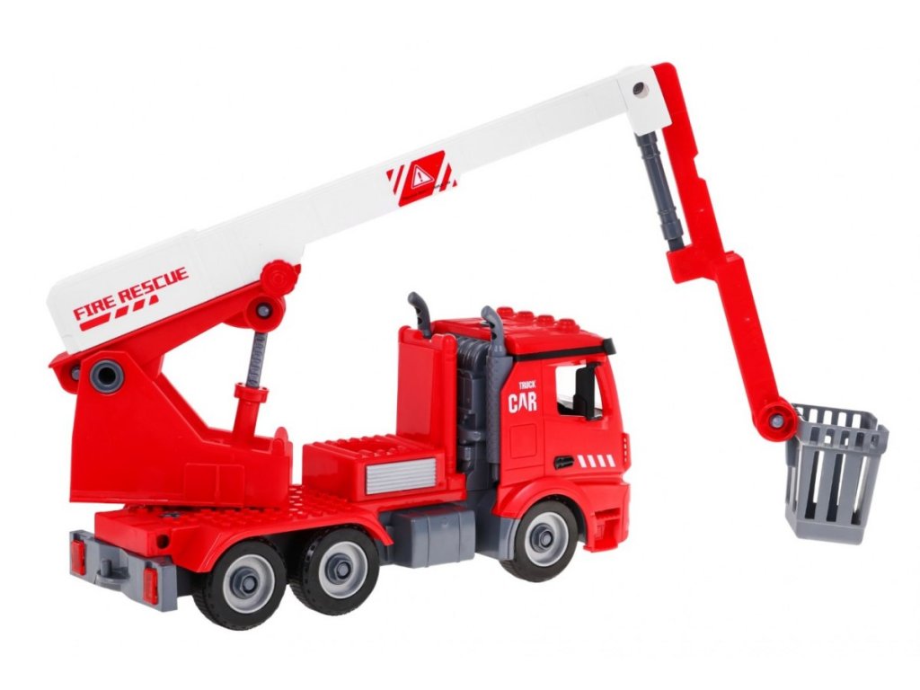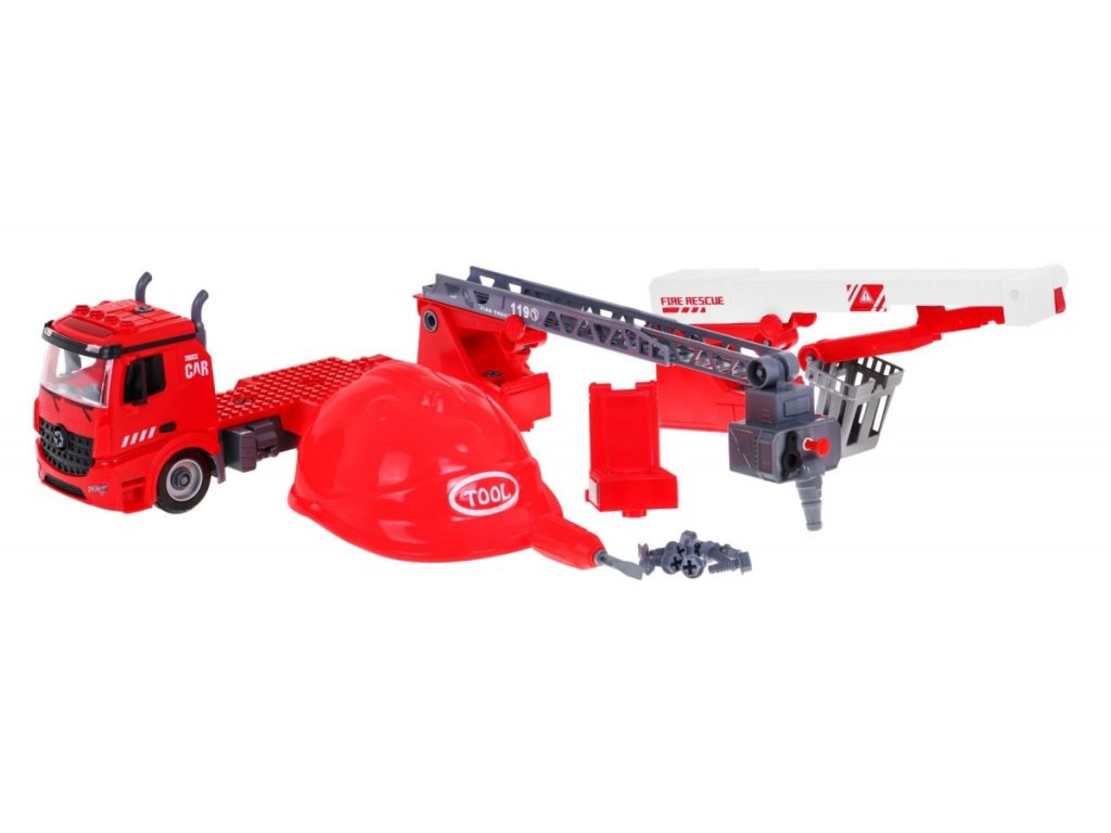 Pentru acei băieți care visează să devină pompier într-o zi, avem un set excelent, o mașină de pompieri 2 în 1 și o cască. Jucăria este destinată copiilor de la 3 ani. Mașina de pompieri trebuie asamblată din părți structurale, inclusiv șuruburi și alte unelte. Mașina are un ridicător detașabil, extensibil și pivotant la 180 de grade cu un coș sau o scară extensibilă și pivotantă cu un tun de apă care funcționează efectiv.