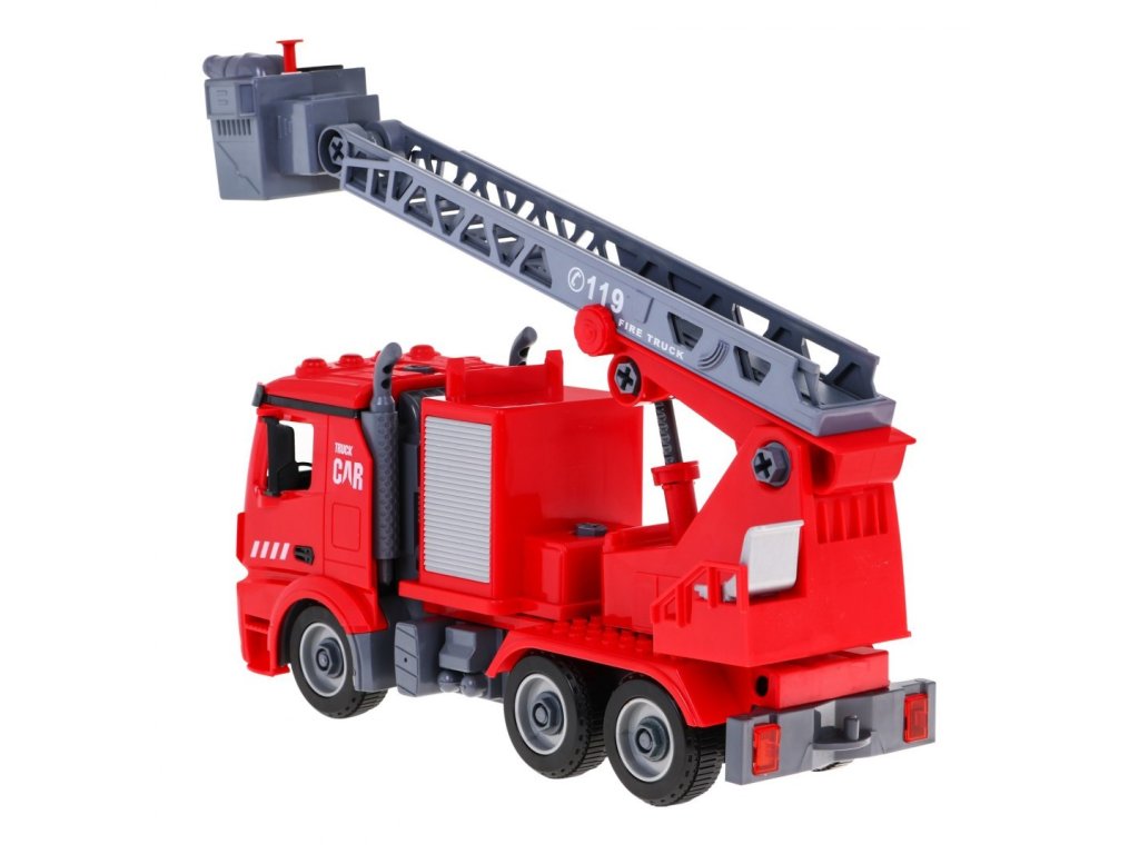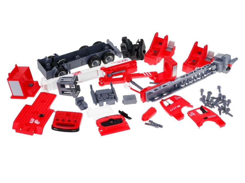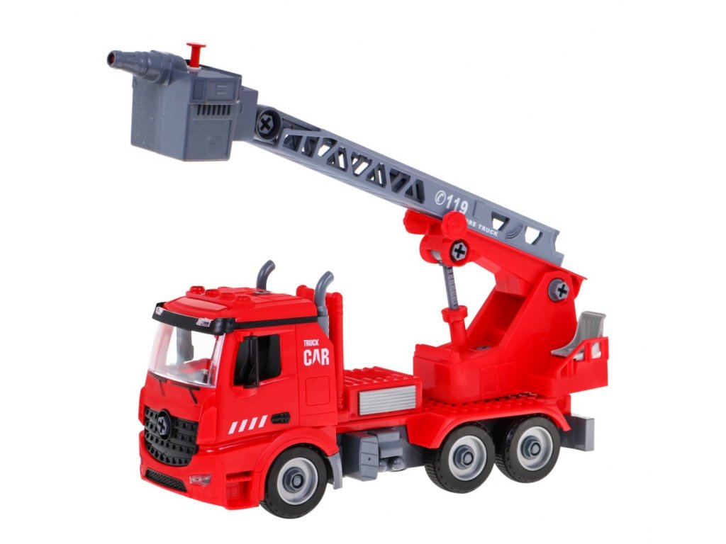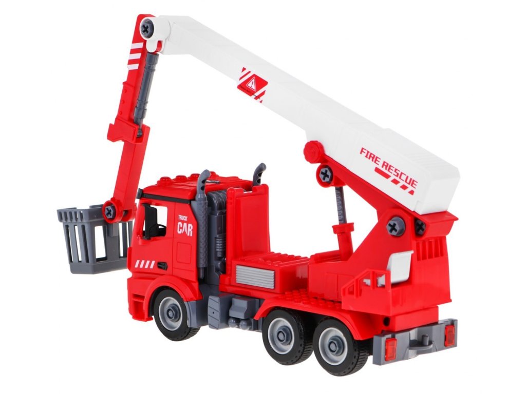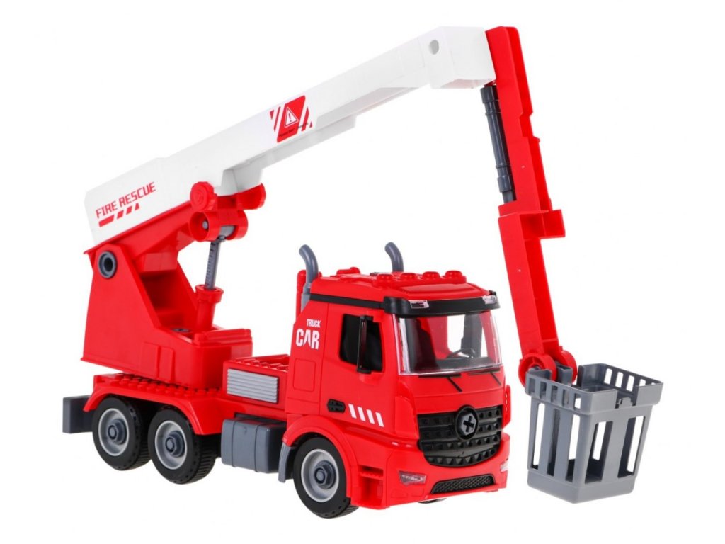 Pentru acei băieți care visează să devină pompier într-o zi, avem un set excelent, o mașină de pompieri 2 în 1 și o cască. Jucăria este destinată copiilor de la 3 ani. Mașina de pompieri trebuie asamblată din părți structurale, inclusiv șuruburi și alte unelte. Mașina are un ridicător detașabil, extensibil și pivotant la 180 de grade cu un coș sau o scară extensibilă și pivotantă cu un tun de apă care funcționează efectiv.