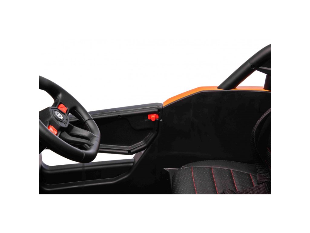 Puteți controla mașina de jucărie folosind o telecomandă care funcționează pe o frecvență de 2,4 GHz . Telecomanda are trei viteze și un buton de siguranță STOP , care oprește imediat mașina de jucărie atunci când este apăsată. Scaunul este acoperit cu piele ecologica si are centuri de siguranta .