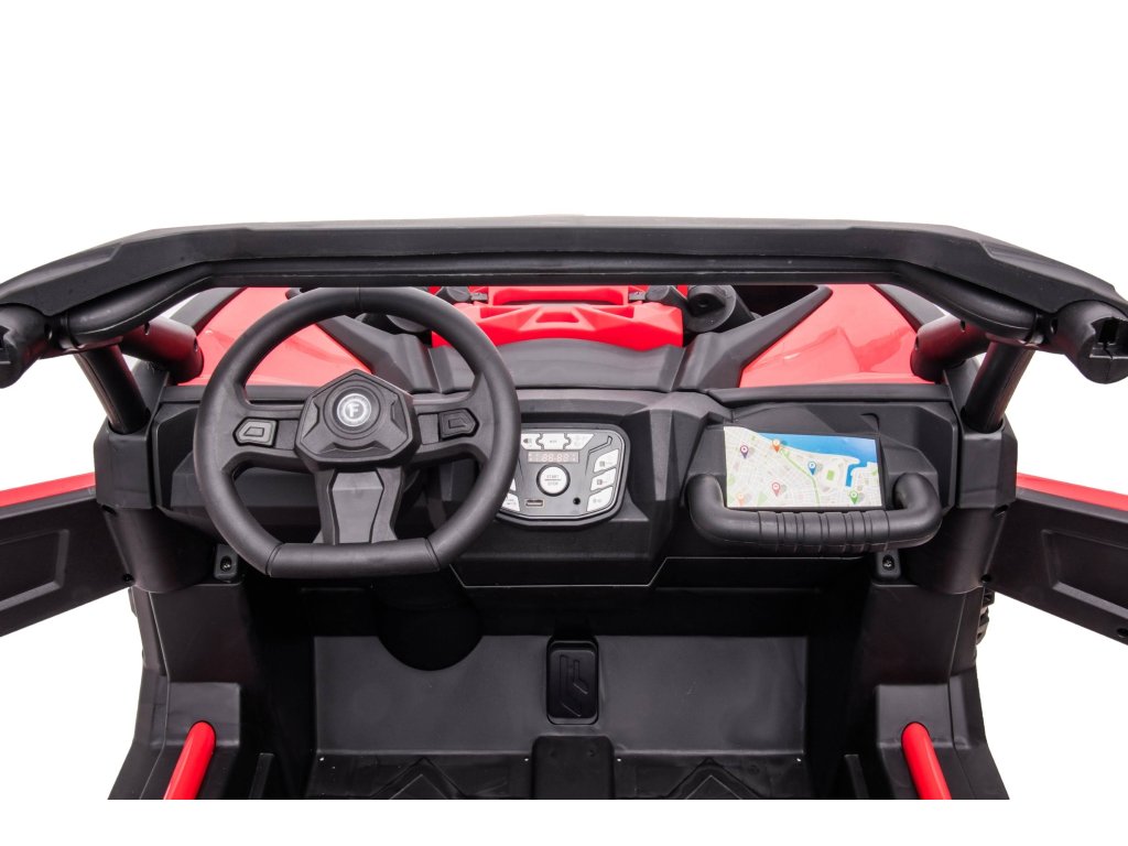 Mașina electrică de jucărie Buggy Turbo cu patru motoare puternice cu o putere totală de 800 W nu trebuie să lipsească din nici un garaj pentru copii. Mașina de jucărie este alimentată de o baterie cu o capacitate de 24V 7Ah . Sarcina maximă a vehiculului este de 60 kg. La pornire, veți auzi sunetele motorului , iar în timpul conducerii, copilul dumneavoastră va fi cu siguranță interesat de panoul muzical cu radio, MP3, melodii pre-redate și, în plus, vă puteți conecta la panoul muzical prin Bluetooth.
