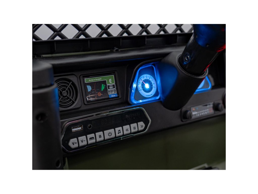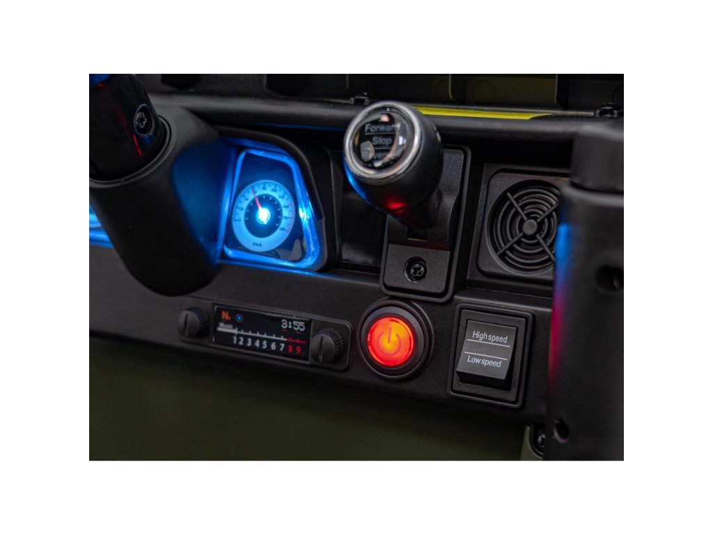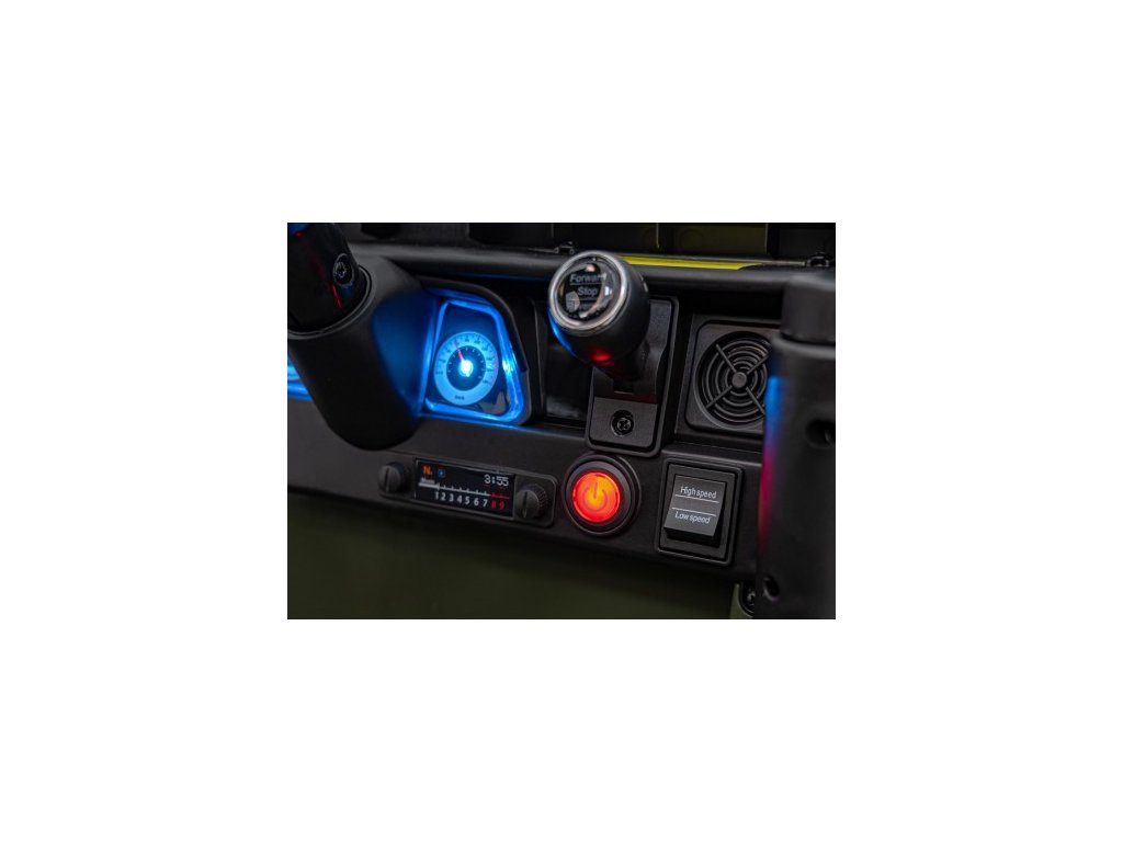 Puteți controla mașina de jucărie folosind o telecomandă care funcționează pe o frecvență de 2,4 GHz . Telecomanda are trei viteze și un buton de siguranță STOP , care oprește imediat mașina de jucărie atunci când este apăsată. Scaunul este acoperit cu piele ecologica si are centuri de siguranta .