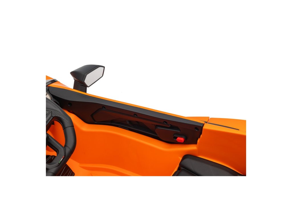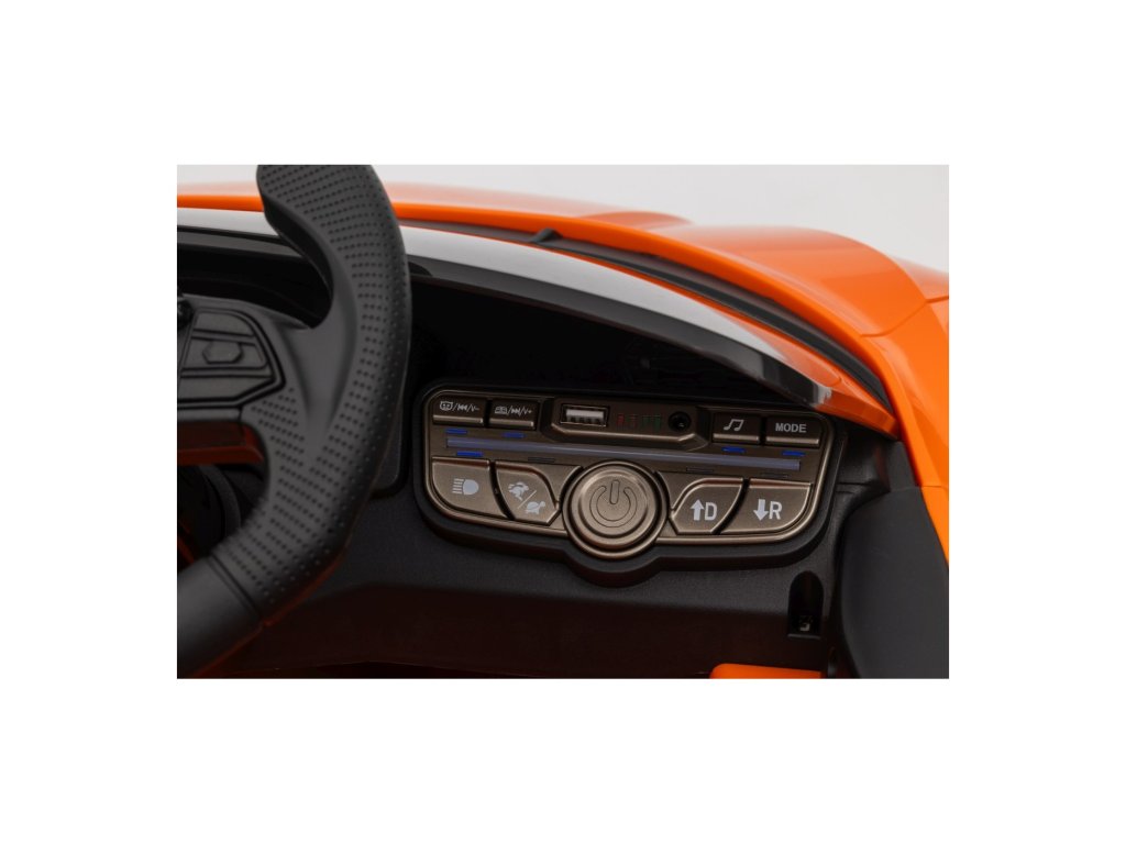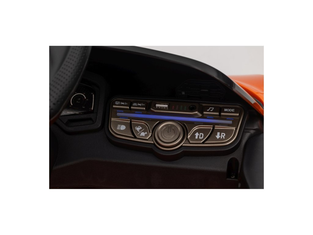 Scaunul negru este confectionat din piele ecologica moale, ceea ce mareste semnificativ confortul la condus, in timp ce volanul pivotant este dimensionat si ponderat pentru a se potrivi mainilor copiilor de cativa ani pentru a asigura manevrarea usoara si evitarea obstacolelor. Pe tabloul de bord există un panou muzical cu port USB, port AUX și Bluetooth. Folosirea mașinii electrice este foarte intuitivă și simplă – tot ce trebuie să faci este să pornești butonul, apoi să apeși pedala de accelerație și să conduci cu grijă. Puteți folosi și a doua soluție - kitul include o telecomandă fiabilă de 2,4 GHz care vă va permite să controlați mașina.