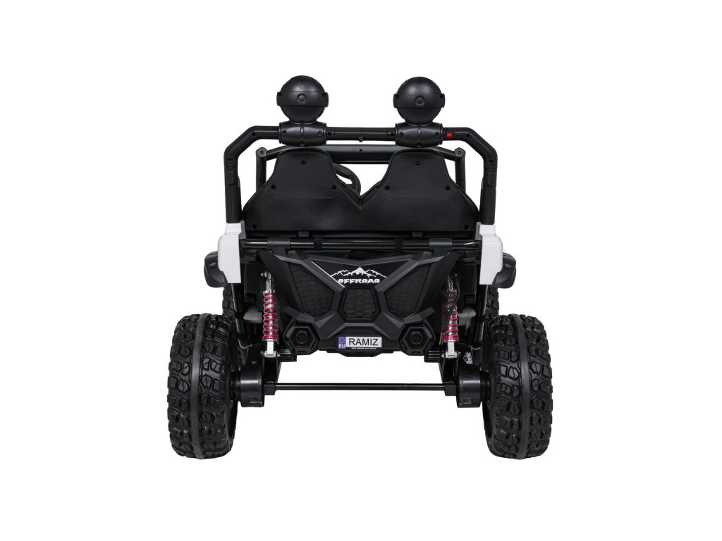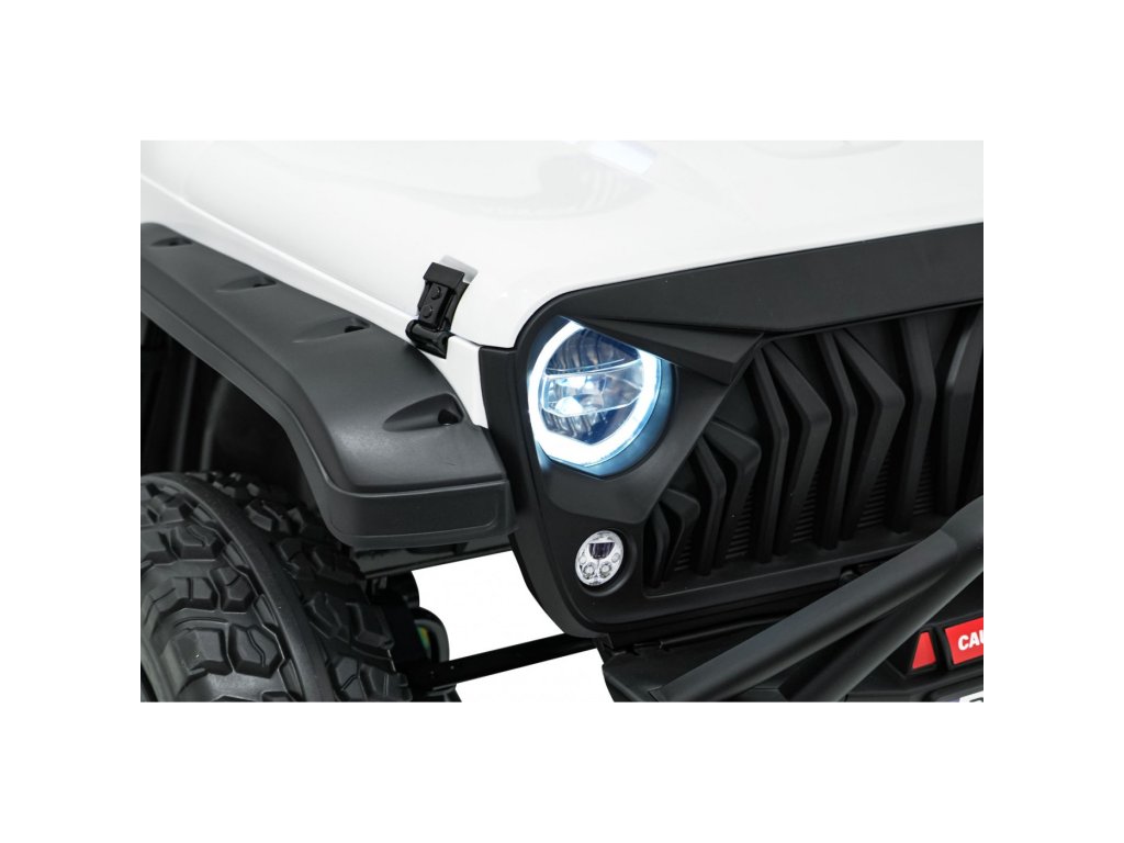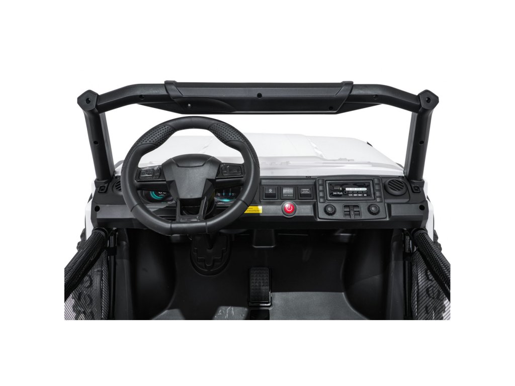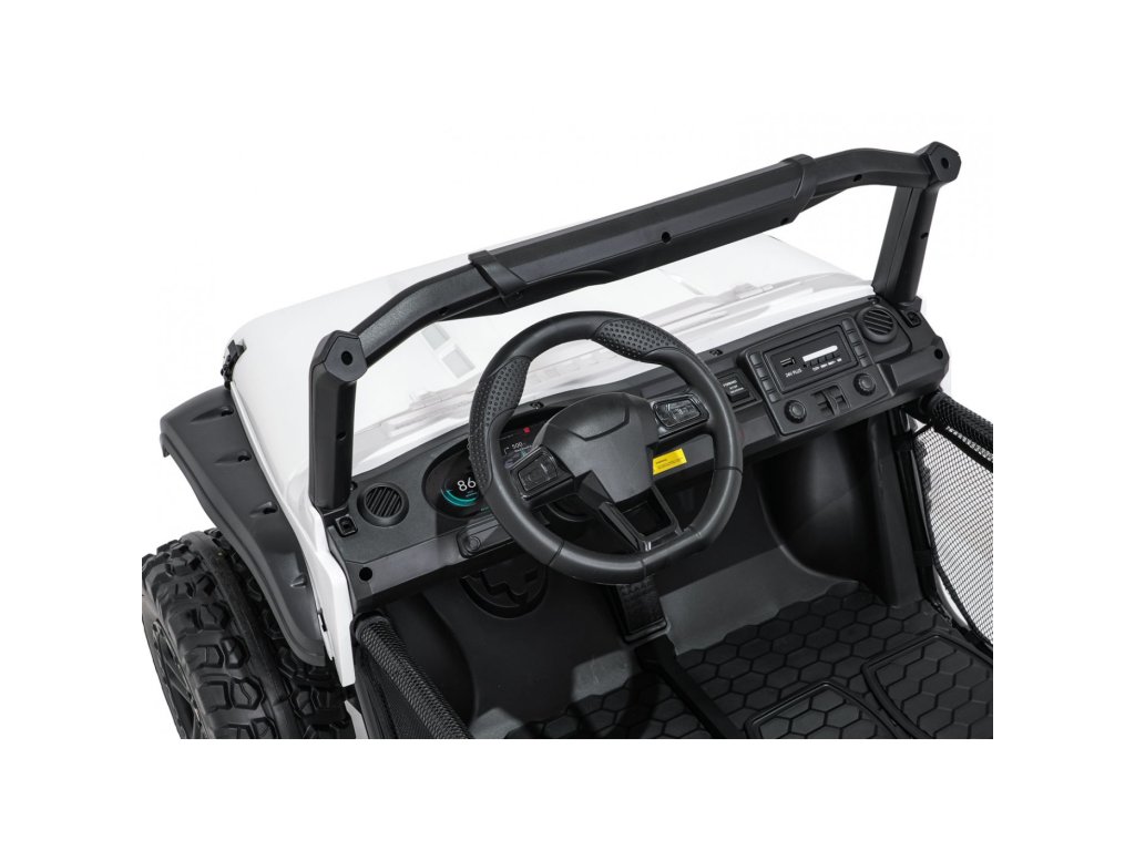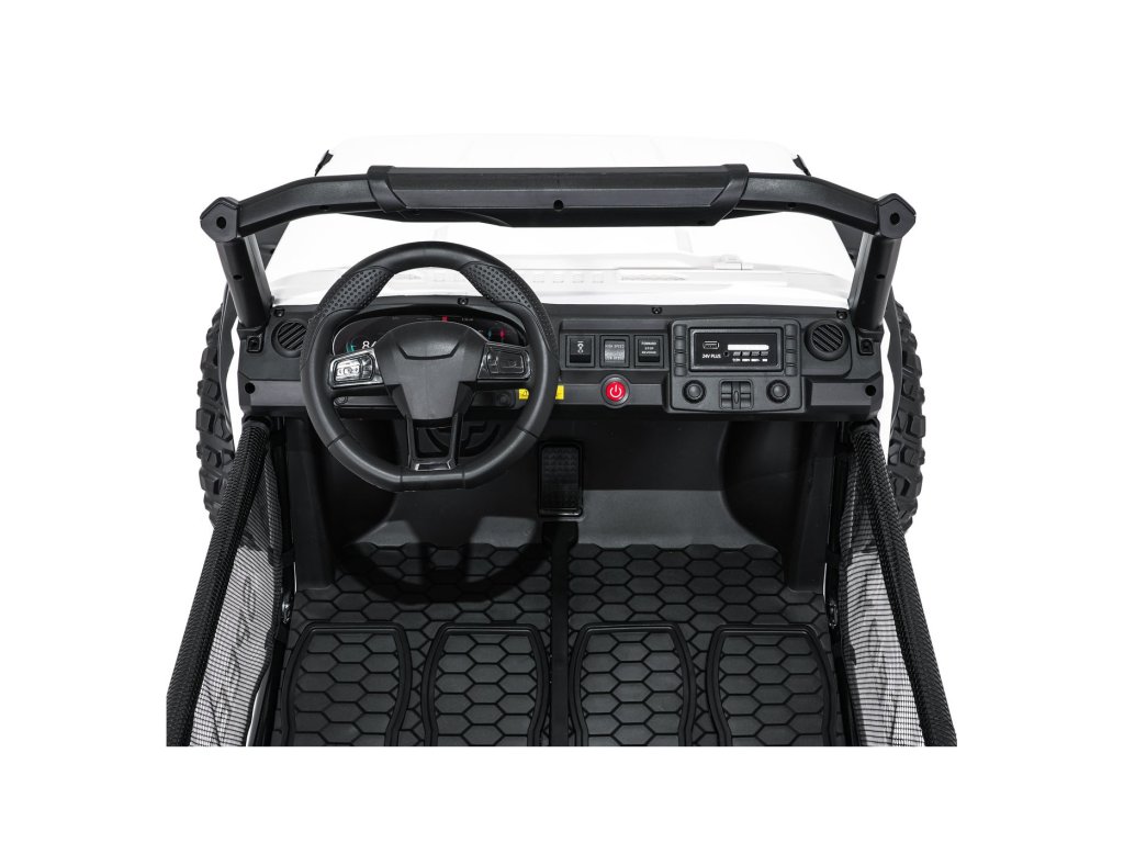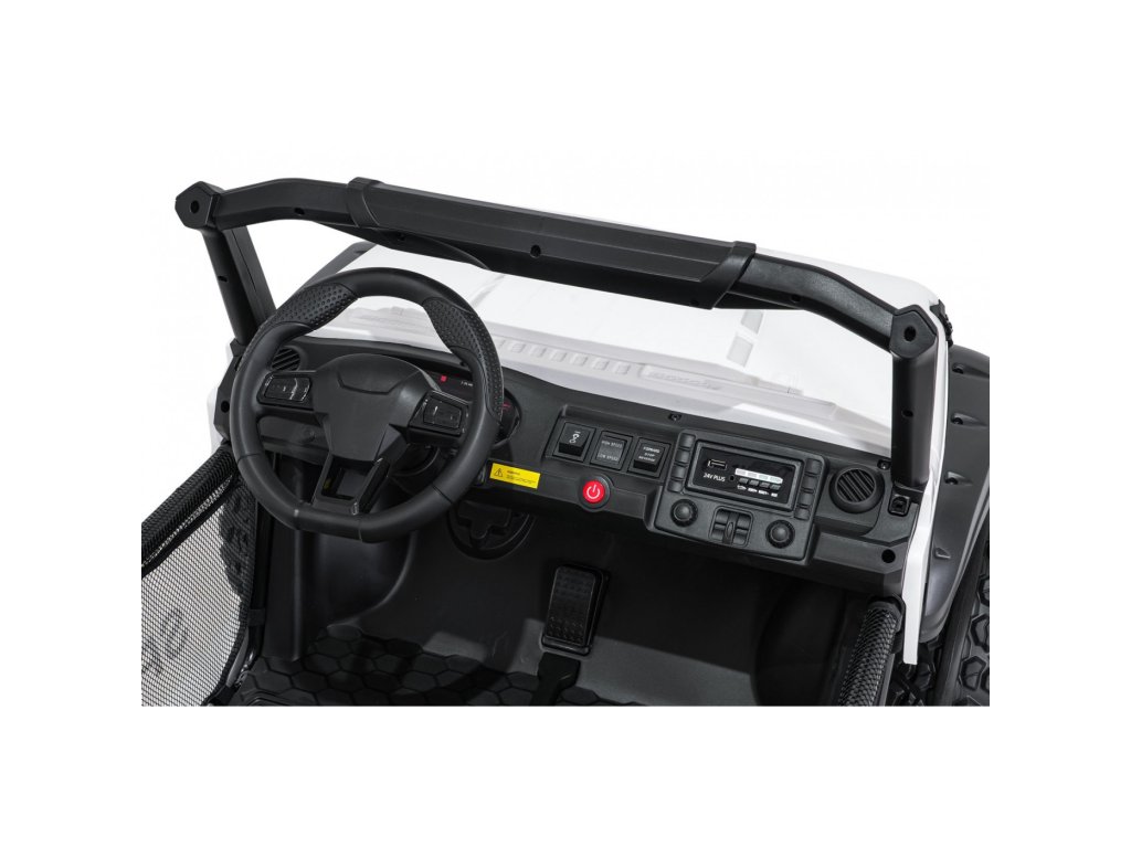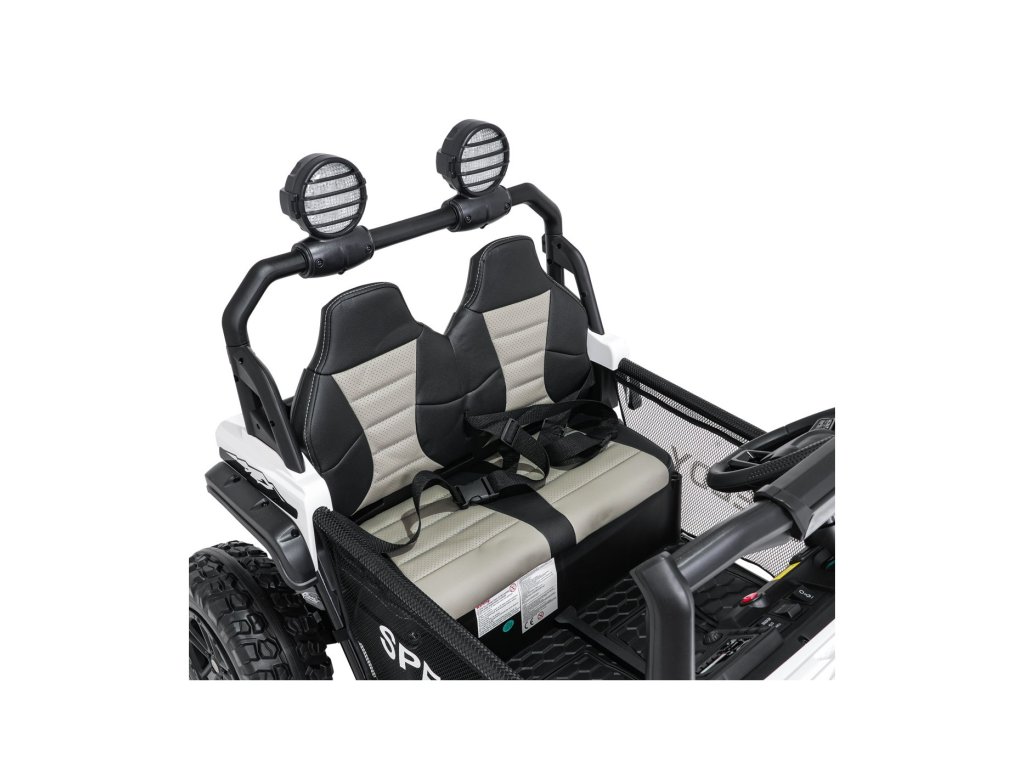Robusta mașinuță off-road pentru copii PASSION 4x4 cu tracțiune integrală oferă performanțe puternice, confort ridicat și un design atractiv. Patru motoare cu o putere de 200 W fiecare, împreună cu roți mari din spumă EVA și amortizoare spate reglabile, pot face față condusului chiar și pe terenuri mai solicitante. Un scaun cu două locuri acoperit cu piele ecologică, centurile de siguranță și iluminarea LED conferă mașinii un aspect realist și siguranță.