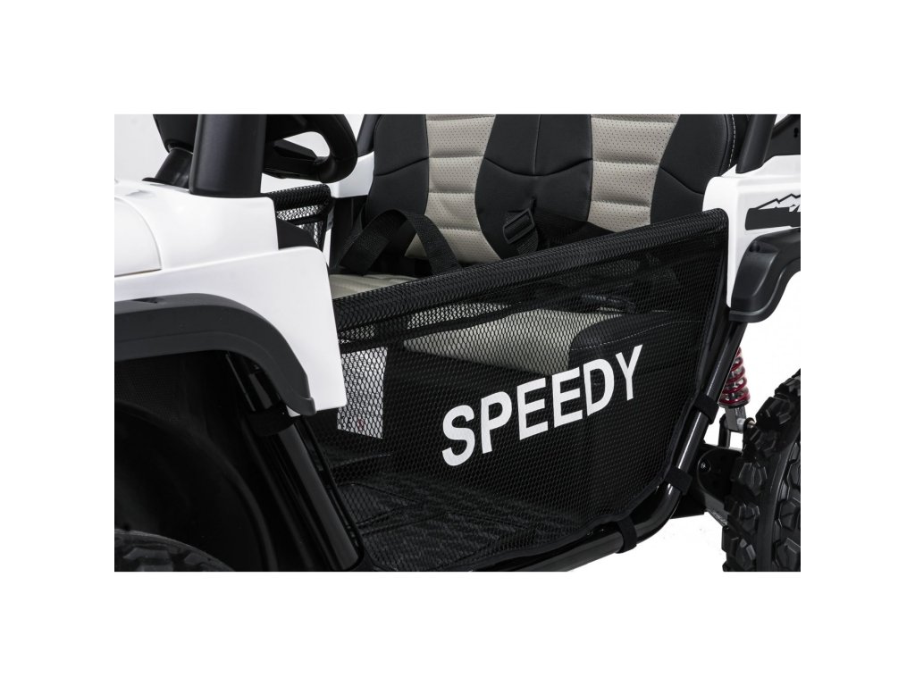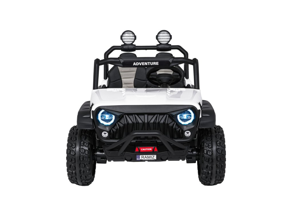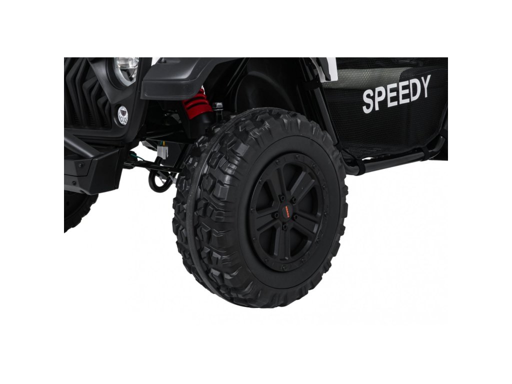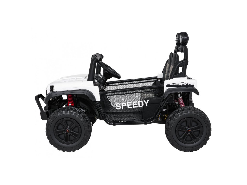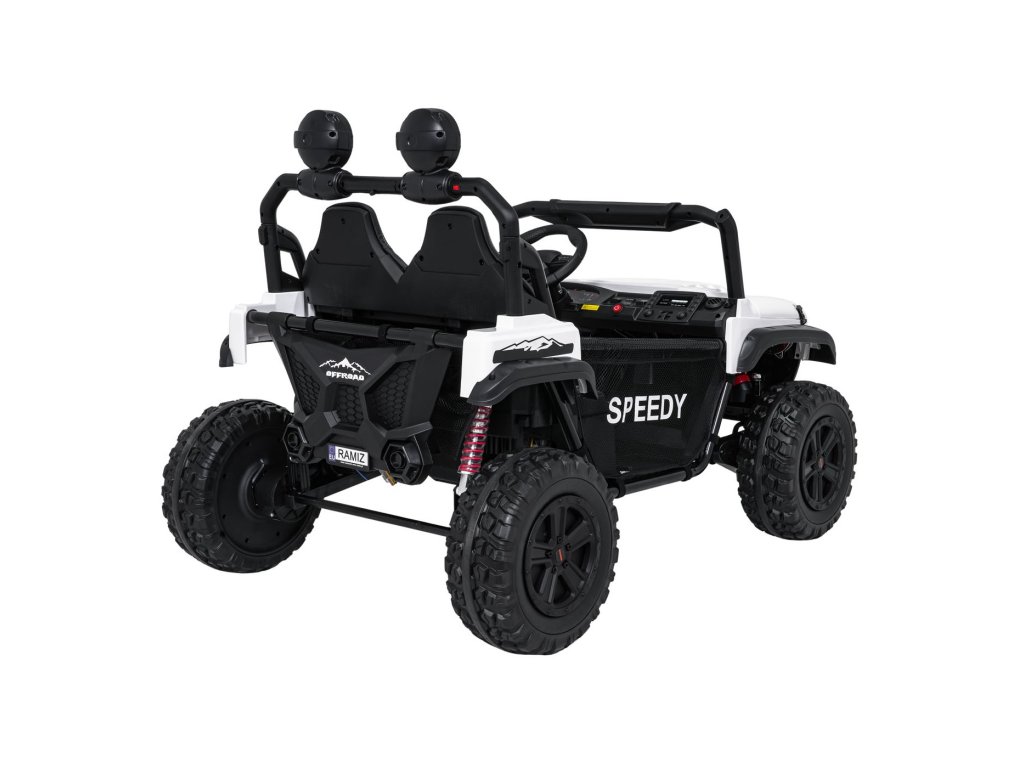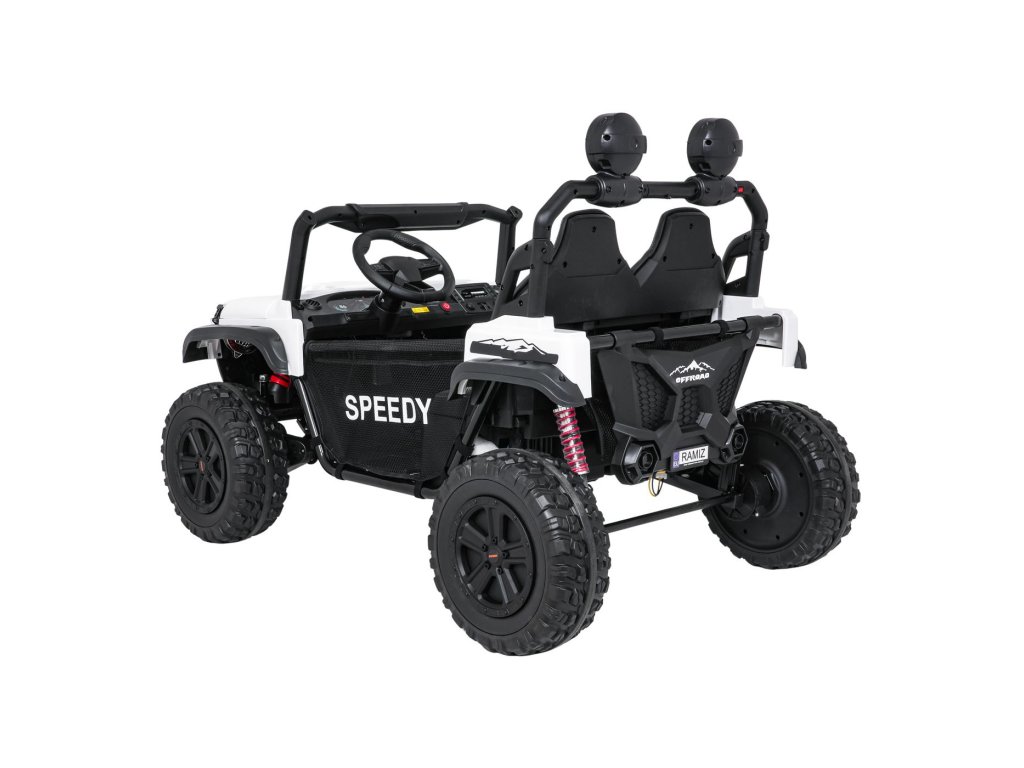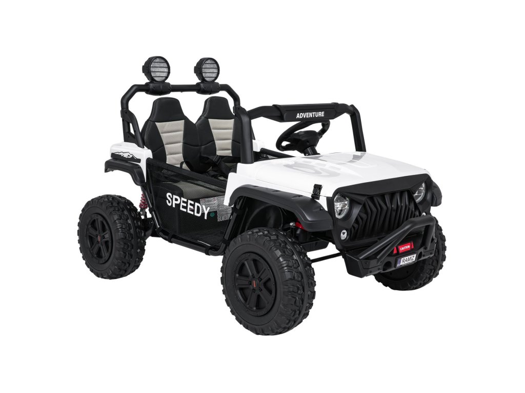 Robusta mașinuță off-road pentru copii PASSION 4x4 cu tracțiune integrală oferă performanțe puternice, confort ridicat și un design atractiv. Patru motoare cu o putere de 200 W fiecare, împreună cu roți mari din spumă EVA și amortizoare spate reglabile, pot face față condusului chiar și pe terenuri mai solicitante. Un scaun cu două locuri acoperit cu piele ecologică, centurile de siguranță și iluminarea LED conferă mașinii un aspect realist și siguranță.