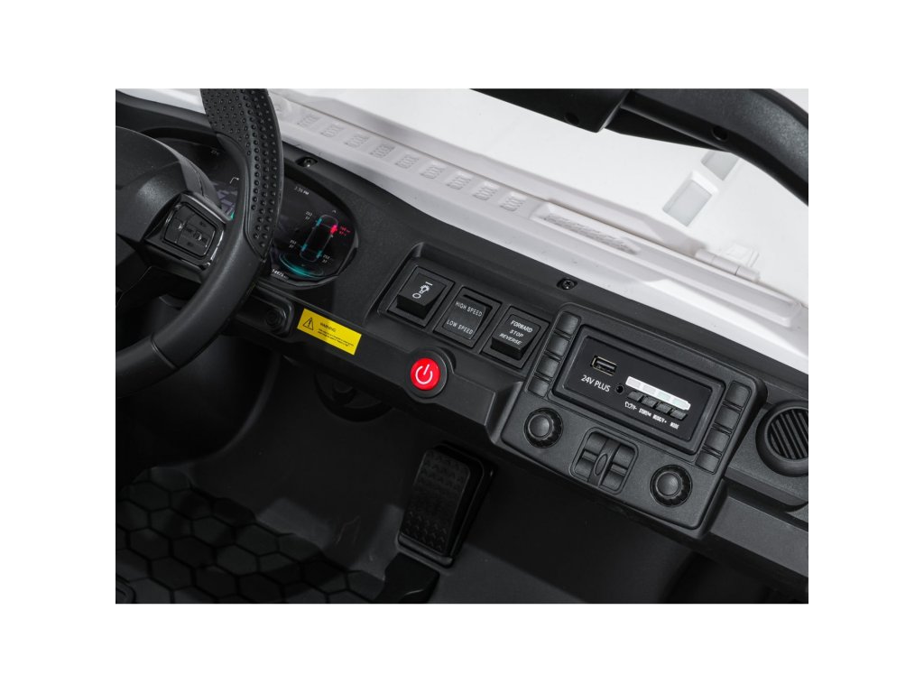 Există, de asemenea, un panou muzical cu conexiuni MP3, USB, AUX și Bluetooth. Datorită telecomenzii cu buton de oprire de siguranță, părinții au control deplin asupra plimbării.