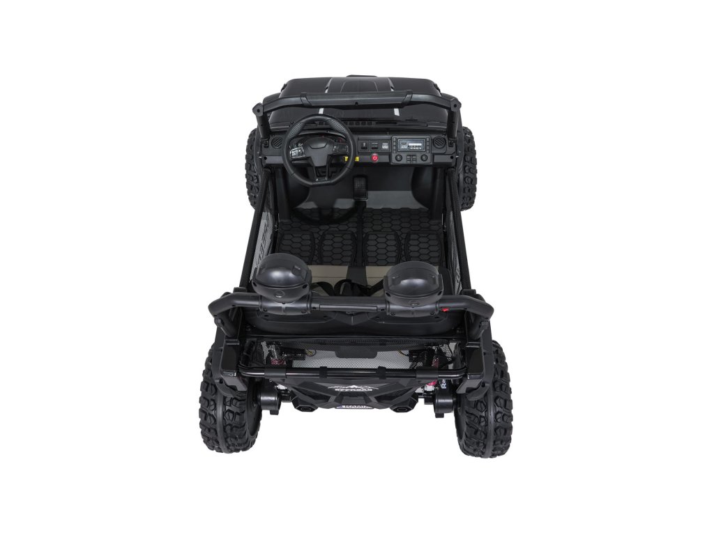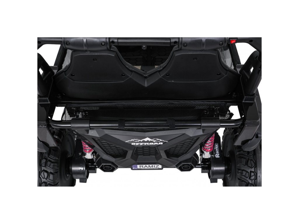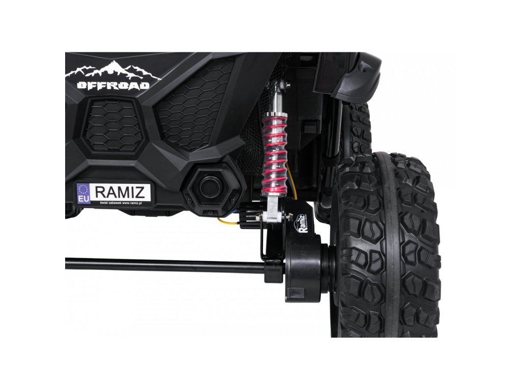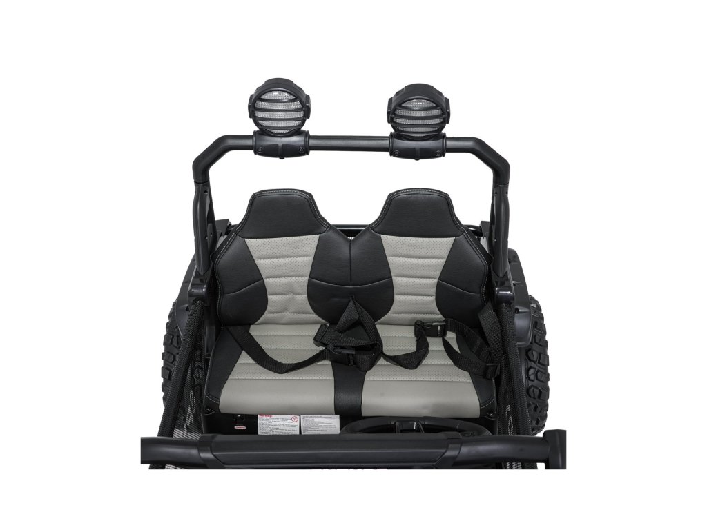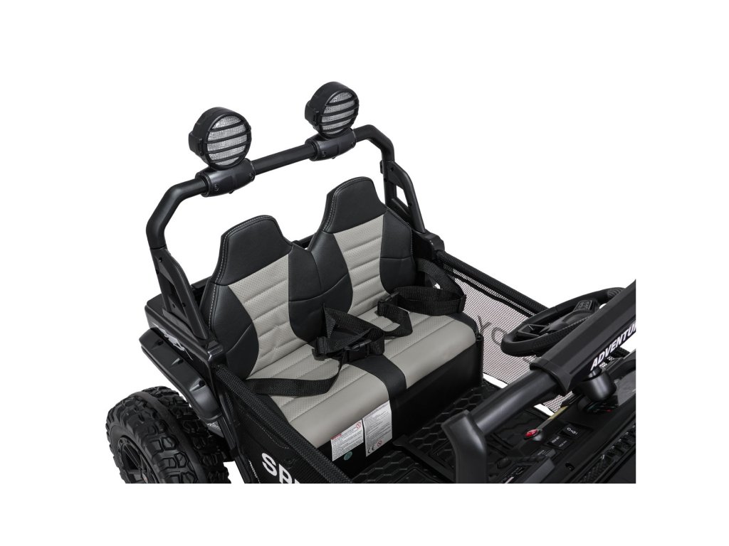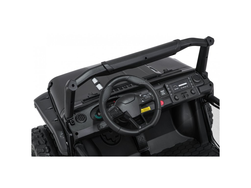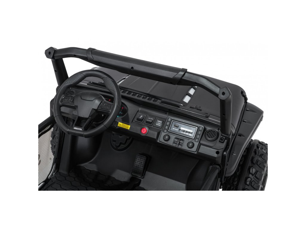 Robusta mașinuță off-road pentru copii PASSION 4x4 cu tracțiune integrală oferă performanțe puternice, confort ridicat și un design atractiv. Patru motoare cu o putere de 200 W fiecare, împreună cu roți mari din spumă EVA și amortizoare spate reglabile, pot face față condusului chiar și pe terenuri mai solicitante. Un scaun cu două locuri acoperit cu piele ecologică, centurile de siguranță și iluminarea LED conferă mașinii un aspect realist și siguranță.