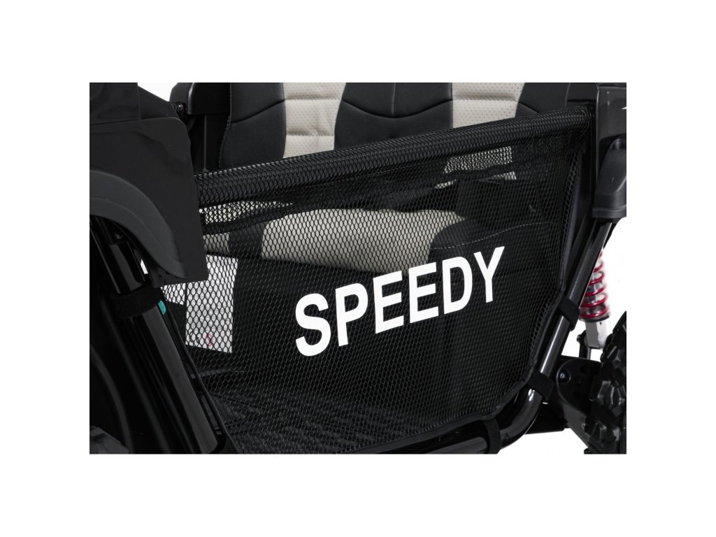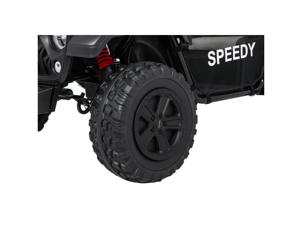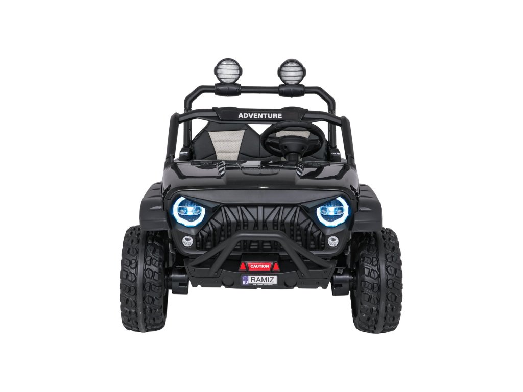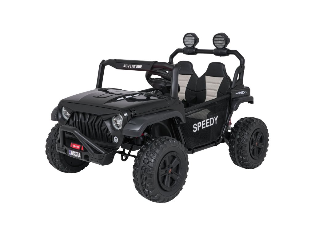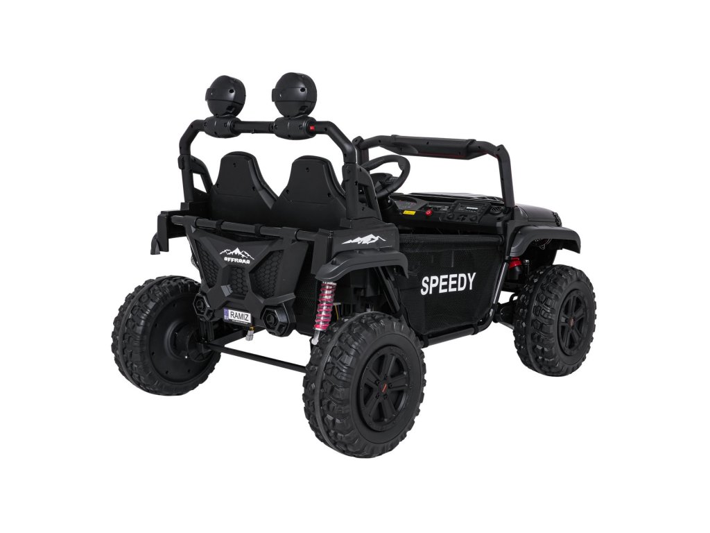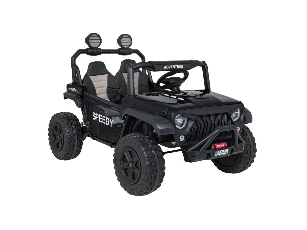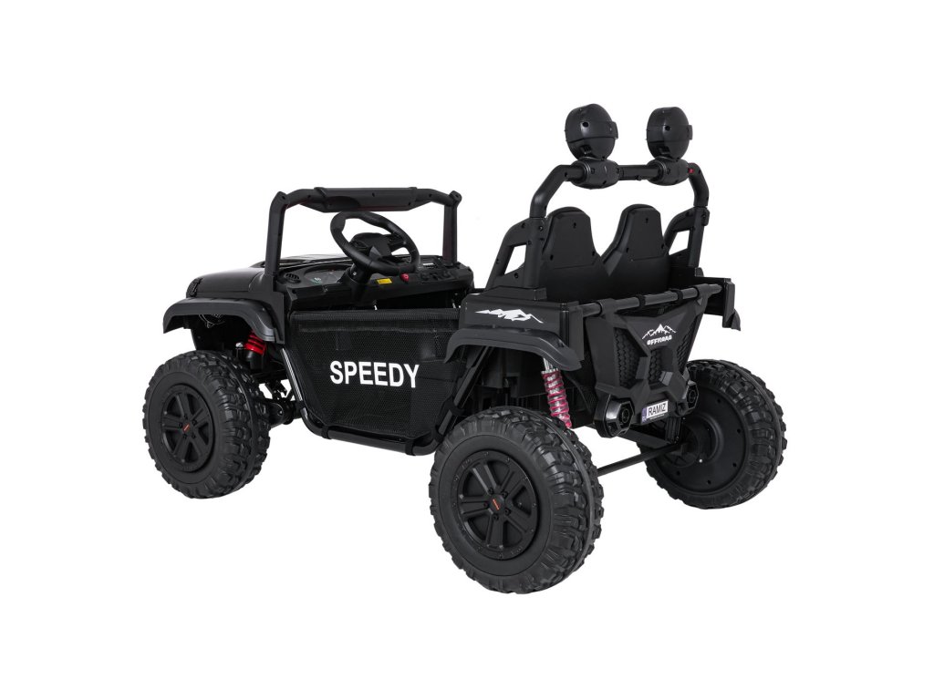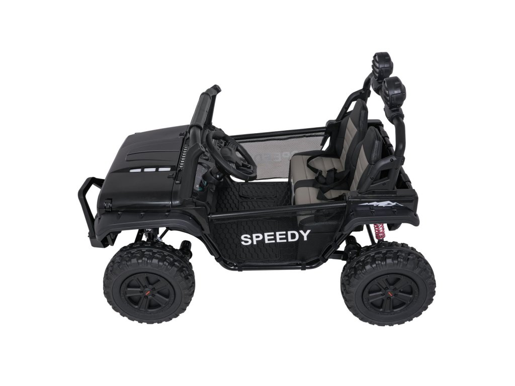 Robusta mașinuță off-road pentru copii PASSION 4x4 cu tracțiune integrală oferă performanțe puternice, confort ridicat și un design atractiv. Patru motoare cu o putere de 200 W fiecare, împreună cu roți mari din spumă EVA și amortizoare spate reglabile, pot face față condusului chiar și pe terenuri mai solicitante. Un scaun cu două locuri acoperit cu piele ecologică, centurile de siguranță și iluminarea LED conferă mașinii un aspect realist și siguranță.