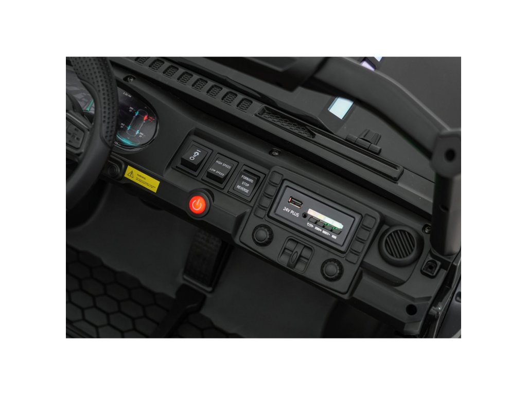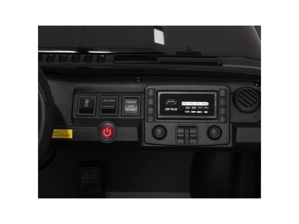 Există, de asemenea, un panou muzical cu conexiuni MP3, USB, AUX și Bluetooth. Datorită telecomenzii cu buton de oprire de siguranță, părinții au control deplin asupra plimbării.