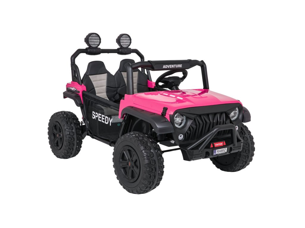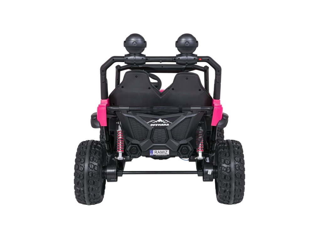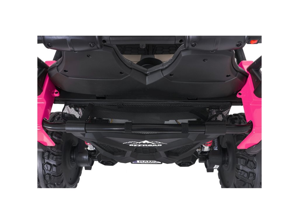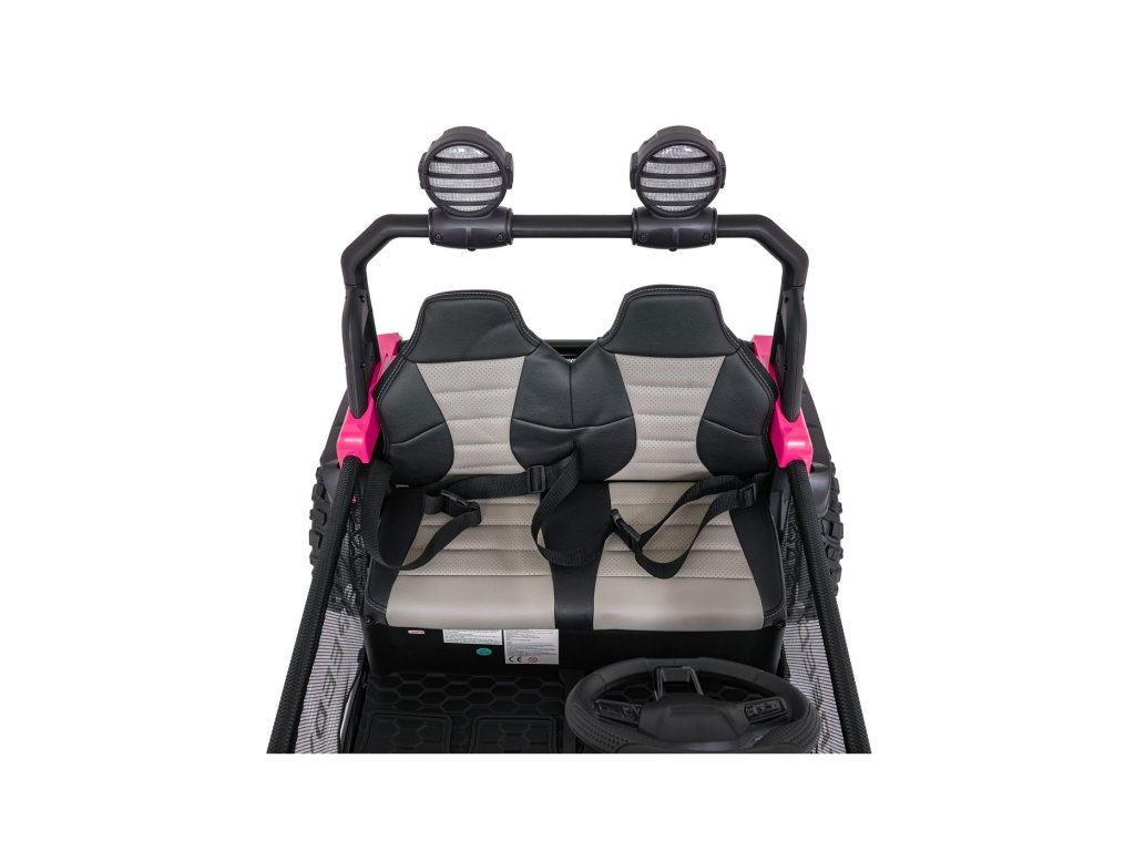 Robusta mașinuță off-road pentru copii PASSION 4x4 cu tracțiune integrală oferă performanțe puternice, confort ridicat și un design atractiv. Patru motoare cu o putere de 200 W fiecare, împreună cu roți mari din spumă EVA și amortizoare spate reglabile, pot face față condusului chiar și pe terenuri mai solicitante. Un scaun cu două locuri acoperit cu piele ecologică, centurile de siguranță și iluminarea LED conferă mașinii un aspect realist și siguranță.