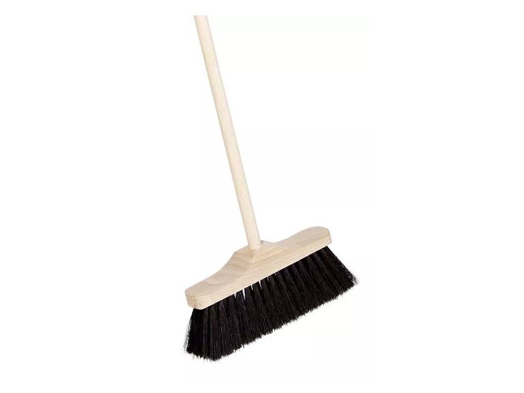 Mătură ușoară din lemn cu peri negri, potrivită pentru joacă și lucrări minore în grădină.