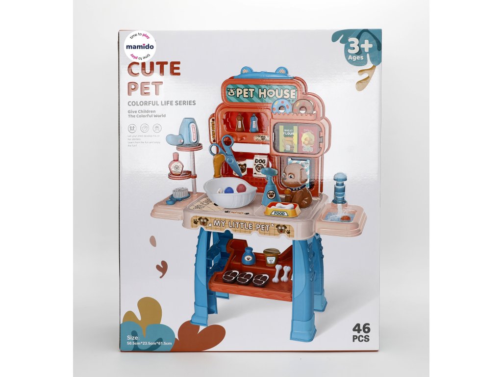 Un set de joacă drăguț pentru micii iubitori de animale, care le permite copiilor să aibă grijă de propriul lor cățeluș. Masa colorată cu accesorii oferă o mulțime de posibilități de joc – copiii pot pregăti mâncare pentru cățeluș, îl pot spăla, usca cu uscătorul de păr sau peria. Nu lipsesc nici accesorii precum foarfeci, sticluțe, boluri sau imitații de recompense pentru câini.
