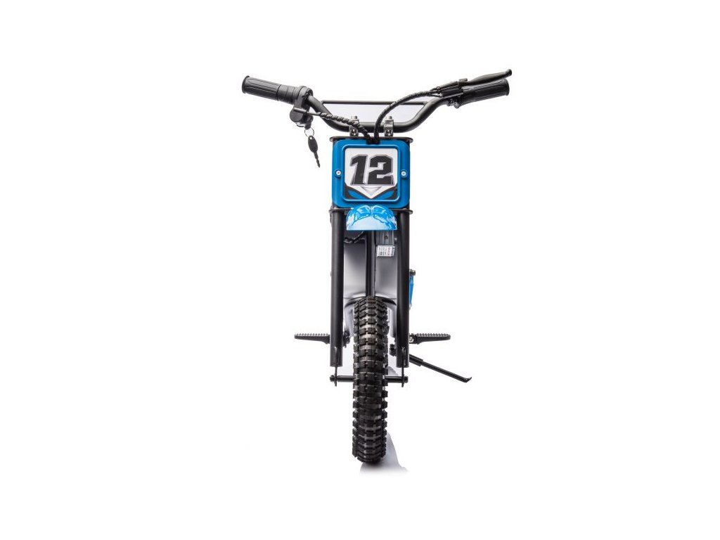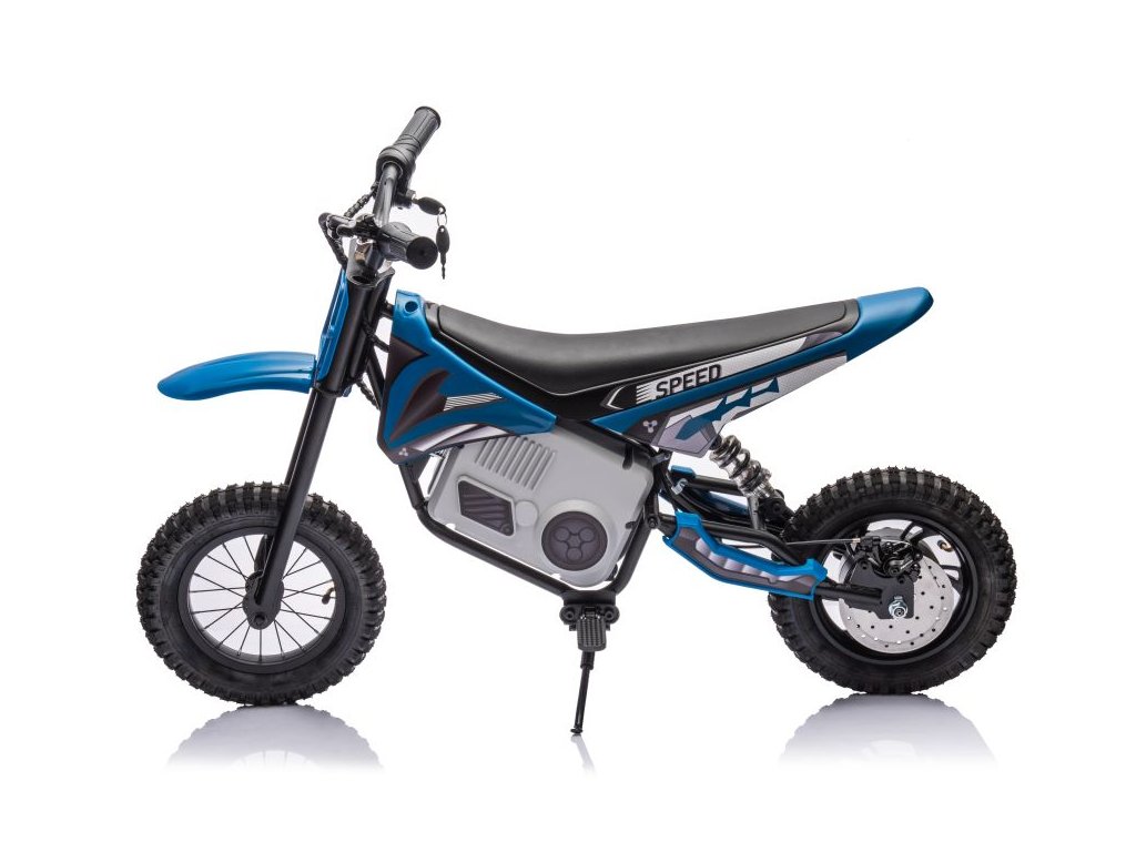 Motocicleta electrică pentru copii Cross vine cu un motor electric puternic și baterii. Copilul stă într-un scaun confortabil, acoperit cu piele ecologică.
