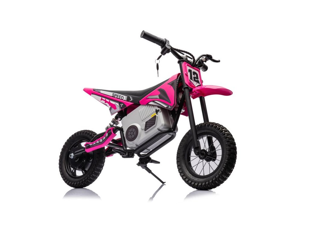 Motocicleta electrică pentru copii Cross vine cu un motor electric puternic și baterii. Copilul stă într-un scaun confortabil, acoperit cu piele ecologică.
