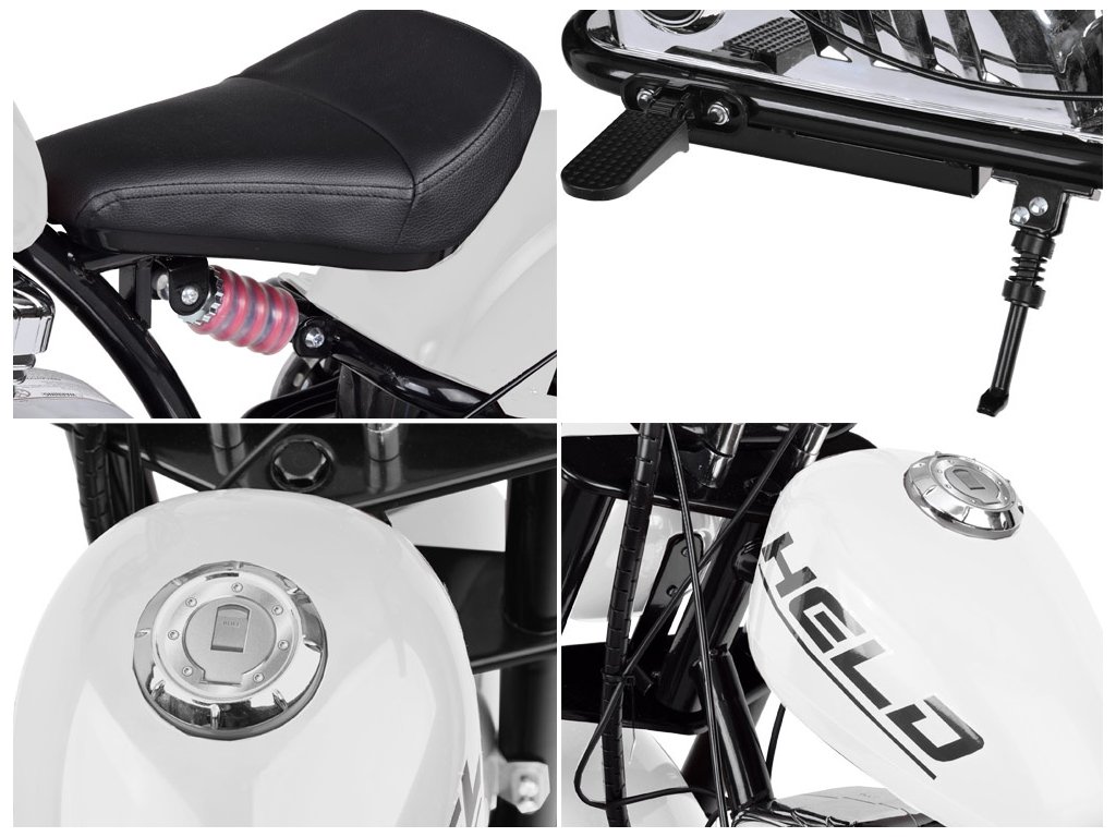 Motocicleta are o frână pe disc spate , care asigură o oprire în siguranță. Roțile gonflabile, suspensia punții spate și un scaun acoperit cu piele ecologică contribuie la o călătorie confortabilă. Pentru o parcare ușoară, modelul este echipat cu un suport . Pachetul include și roți laterale , care ajută la primele călătorii și pot fi îndepărtate ulterior.