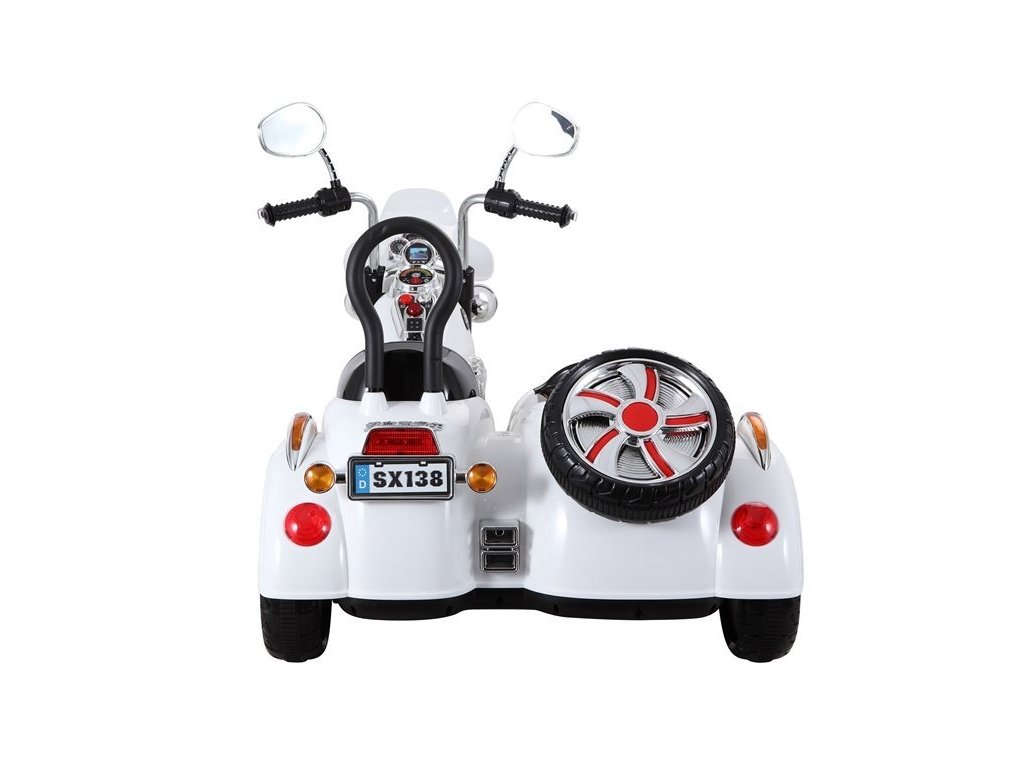 Motocicletă electrică Chopper pentru copii cu un motor puternic de 2x45W. Copilul are voie să circule cu o viteză de 3 până la 5 km/h într-un cărucior care este atașat de motocicletă, iar copilul are voie să transporte pasageri de până la 10 kg. Motocicleta este echipată cu un panou audio care redă muzică MP3. De asemenea, copilul poate lumina călătoria cu luminile frontale LED.
