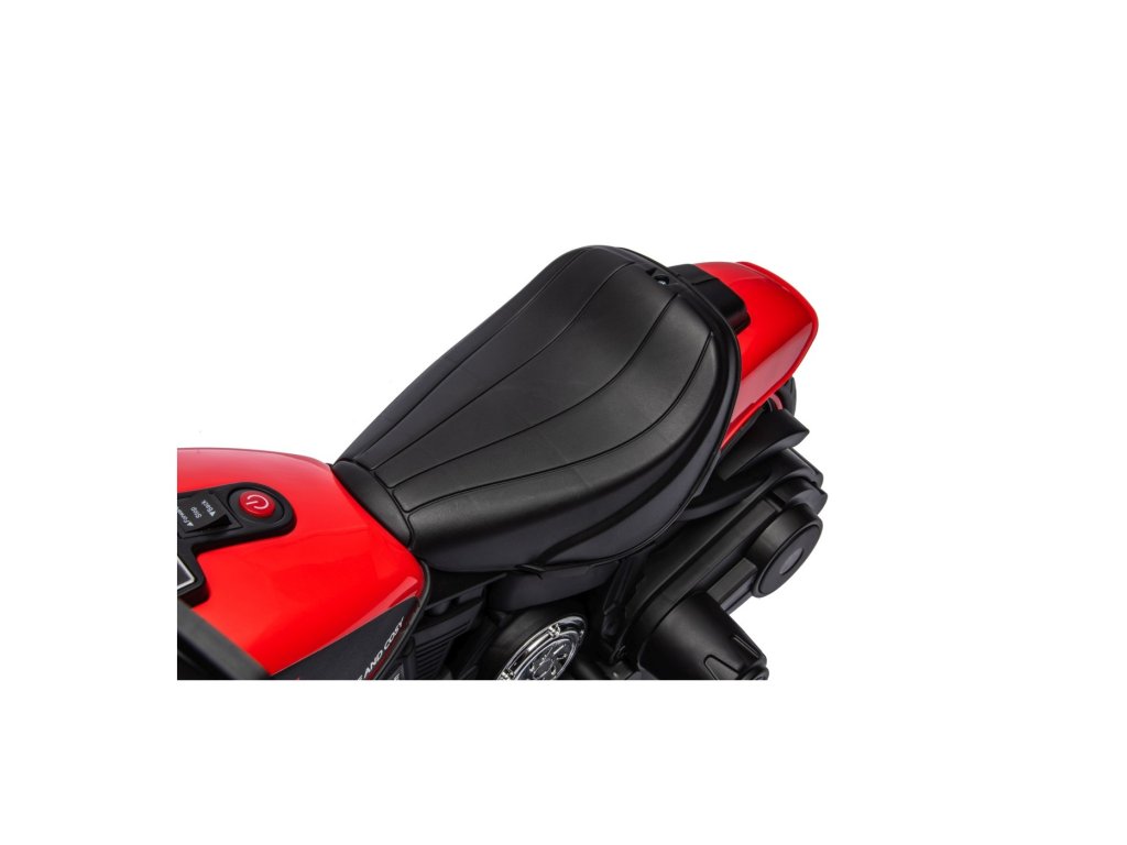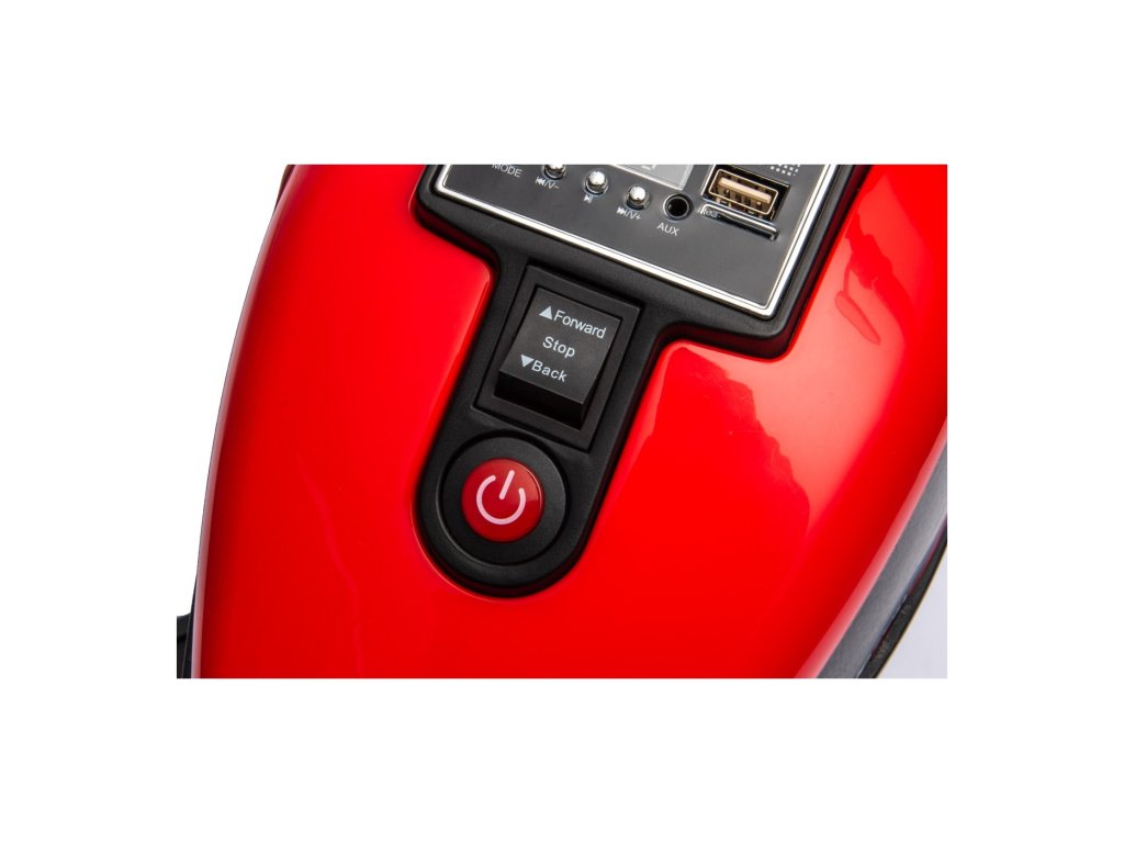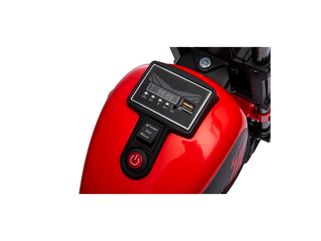 Motocicletă pentru copii Chopper Faster cu echipament bogat și design inovator. Interiorul mașinii de jucărie este echipat cu un scaun din plastic, un panou muzical cu Bluetooth, Radio , MP3, USB, SD, intrări AUX și muzică preinstalată. Luminile LED din față luminează drumul.
