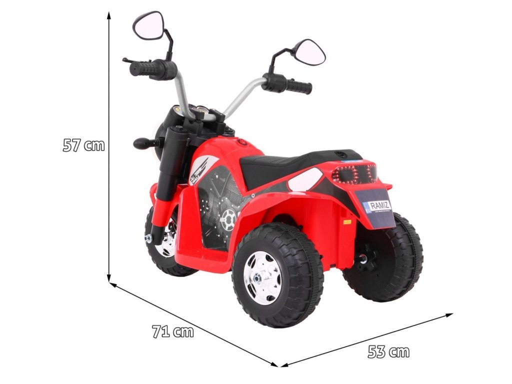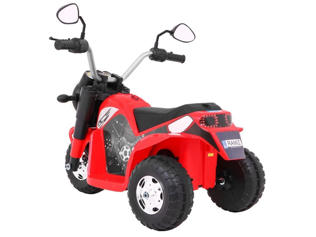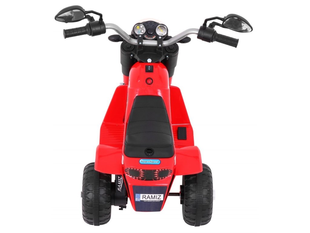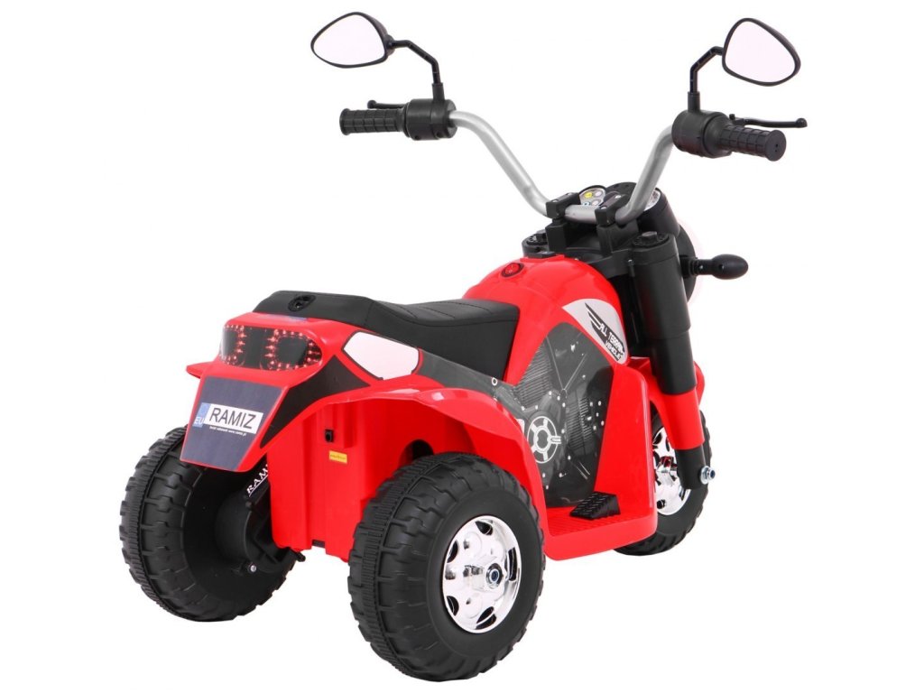 Nu numai fanii Harley vor adora această bicicletă electrică pentru copii ! O motocicleta pentru copii cu un design elegant are intr-adevar multe de oferit. Primul lucru de menționat este echipamentul său. Motocicleta are scaune elegante din piele din piele ecologică pentru confortul și așezarea corectă a copilului, Ghidon fix care îi va oferi copilului stilul potrivit de motociclist dur și oglinzi retrovizoare astfel încât copilul să-și poată urmări părinții călând și vântul în părul lui. Pentru o senzație de minibicicletă potrivită, motocicleta scoate sunete la pornire și are alte efecte sonore. Motocicleta este dotata cu lumini LED pentru ca copilul sa poata fi vazut chiar si dupa intuneric, pentru ca va dori sa petreaca ore intregi pe aceasta motocicleta pentru copii.