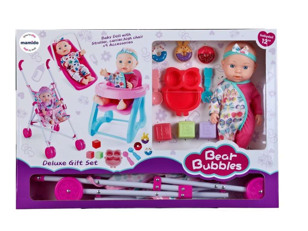 Bebelușul cu o expresie drăguță, îmbrăcat într-un costum colorat și cu membre mobile, este gata să fie îngrijit în toate privințele. Căruciorul pliabil permite transportarea ușoară, scaunul de masă oferă spațiu pentru hrănire, iar suportul de transport/șezut servește pentru odihna liniștită a păpușii. Setul include, de asemenea, o serie de accesorii – farfurioară, linguriță, cuburi, jucărie și alte accesorii.