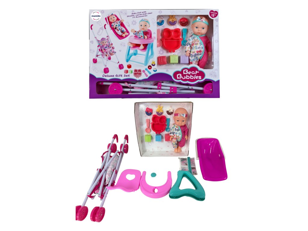 Un set mare de cadouri pentru mici îngrijitoare! Păpușa de 30 cm vine cu un set bogat care include un cărucior, un scaun de masă, un port-bebe/leagăn și o mulțime de accesorii distractive. Ideal pentru jocul de-a mama și dezvoltarea imaginației.