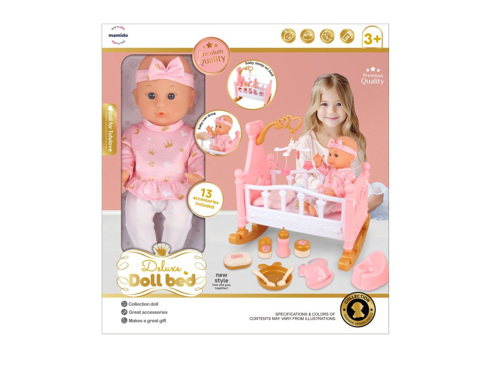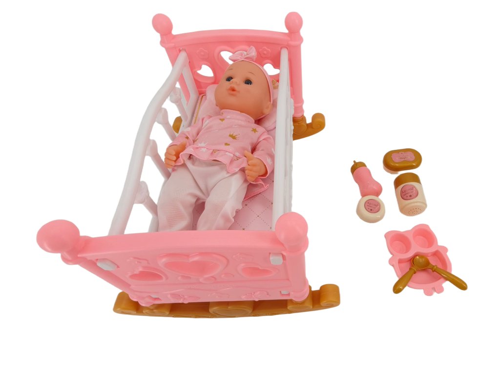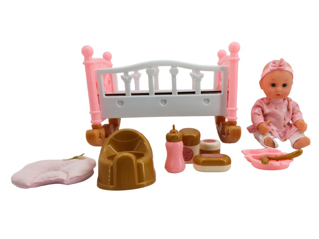 Setul include un elegant pătuț roz, stilizat ca un pat clasic de copil, care oferă păpușii un loc confortabil pentru odihnă. Culorile pastelate delicate și elementele decorative atrag imediat atenția și se integrează perfect în lumea jocurilor copiilor.