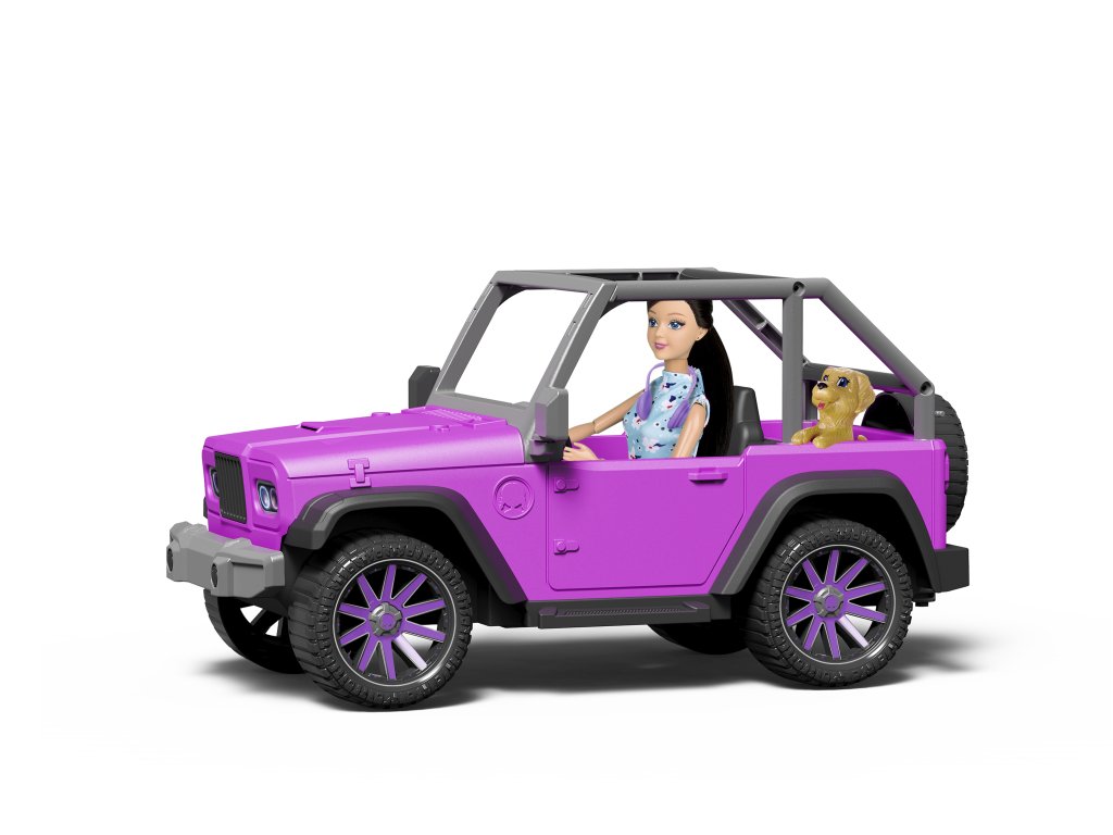 Jeep-ul are o construcție deschisă, roți mari și detalii realiste, datorită cărora jocul este și mai distractiv. Păpușa are haine moderne și căști, fiind astfel pregătită pentru o plimbare prin oraș și prin natură. Mare prieten canin poate sta în mașină și o poate însoți pe păpușă în toate călătoriile.
