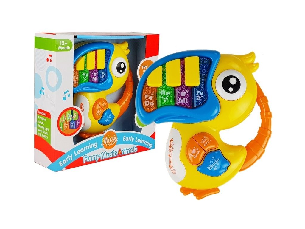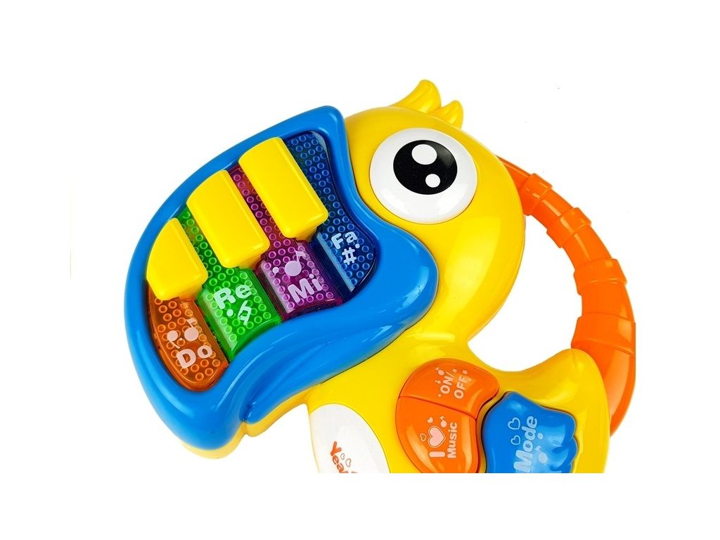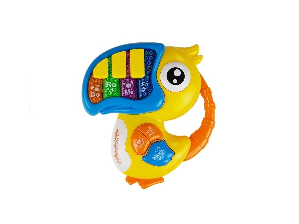 Dezvoltarea corectă și zâmbetul pe buze sunt foarte importante în viața fiecărui copil. Funcțiile diferite ale pianului pentru bebeluși , precum și culorile și modelele sale, îl vor face pe copil să înceapă să distingă și să învețe noi sunete, culori și forme încă de la o vârstă fragedă. Cântarea la pian va afecta pozitiv auzul și vederea copilului dumneavoastră și îi va stimula imaginația. Pianul în formă de papagal colorat va încânta fiecare copil, are butoane muzicale iar distracția este însoțită de luminile strălucitoare ale butoanelor „DO”, „RE” și „MI”. Jucăria este pornită cu butonul ON / OFF. Alături de acesta se află butonul „MODE”, care schimbă modurile sunetelor pianului. Apăsați tastele pentru a asculta melodii vesele, sunete de animale sau sunete standard de pian și cântați propria melodie.