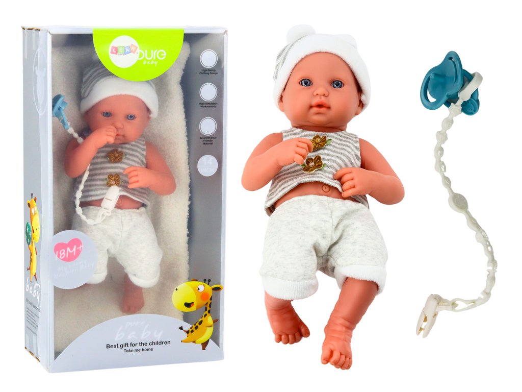 Papusa Bobas in haine albe si gri cu suzeta si patura